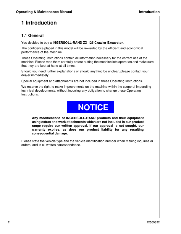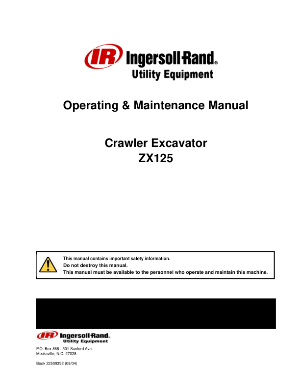Ingersoll-Rand Bobcat ZX125 Crawler Excavator Operation and Maintenance Manual