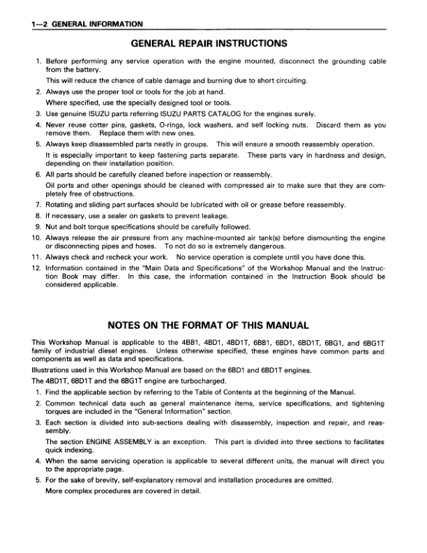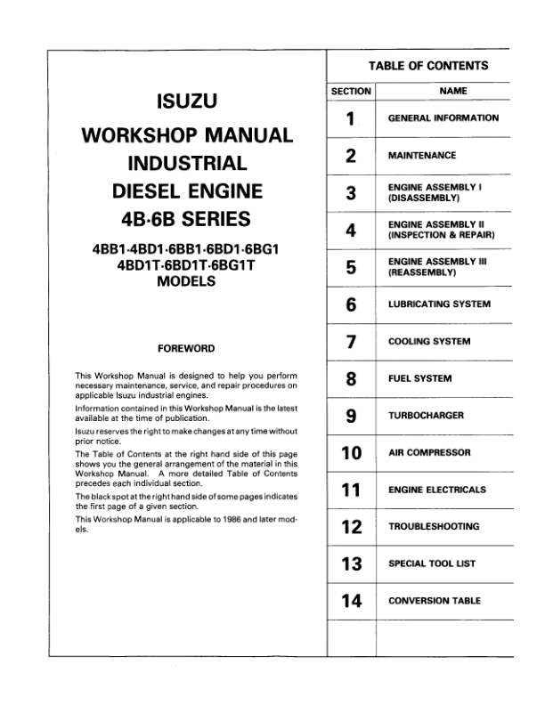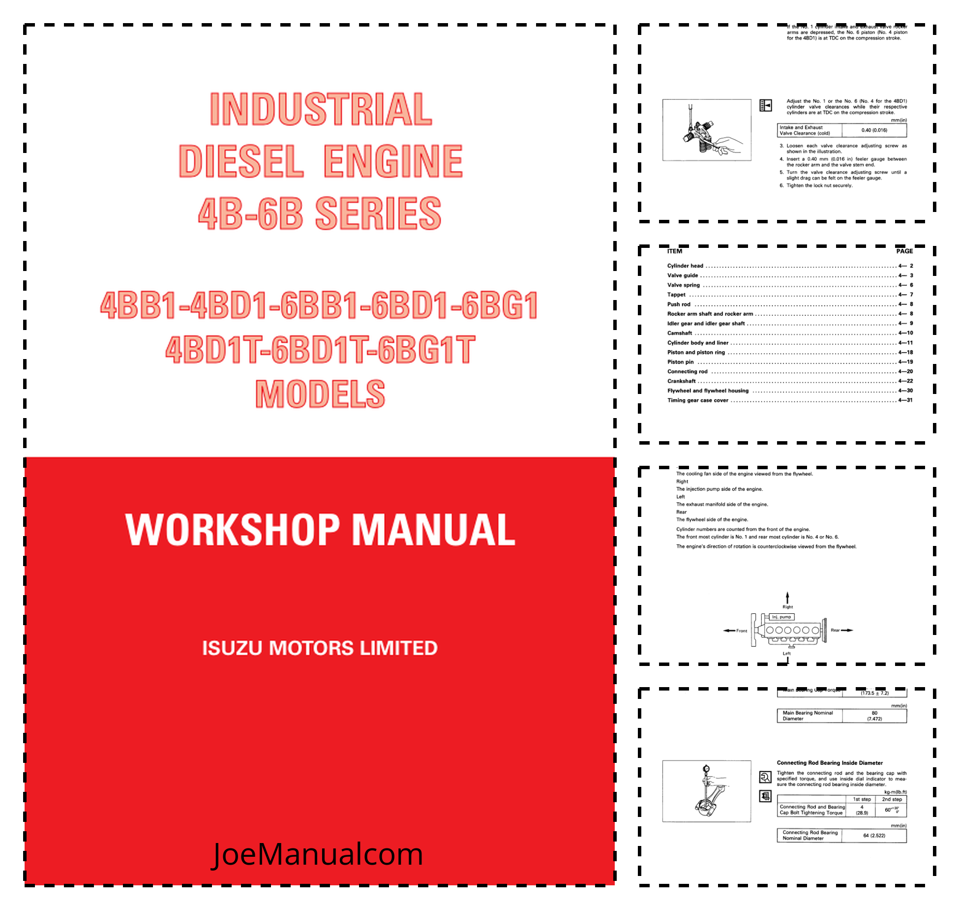 Comprehensive workshop manual for ISUZU 4B and 6B series diesel engines. This manual provides detailed instructions for maintenance, repair, and overhaul procedures. Essential for technicians and mechanics working on these engines, offering complete guidance for troubleshooting and component servicing.