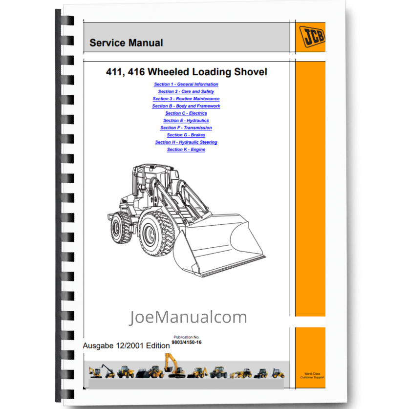 The JCB 411 416 Wheeled Loader Service Manual 9803/4150 is a comprehensive guide for the maintenance and repair of JCB 411 and 416 wheeled loaders. This manual provides detailed instructions on servicing all major components, including the engine, hydraulics, transmission, and electrical systems. With clear diagrams, technical specifications, and step-by-step procedures, this manual is essential for technicians performing routine maintenance or complex repairs, ensuring the optimal performance and longevity of the JCB 411 and 416 wheeled loaders.