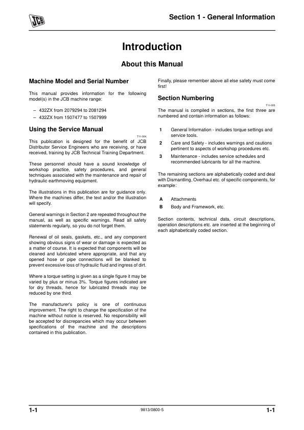 JCB 432 ZX Wheel Loader Service Manual 9813/0800 The JCB 432 ZX Wheel Loader Service Manual 9813/0800 is a comprehensive guide designed for technicians and operators to maintain and service the JCB 432 ZX wheel loader. It provides detailed instructions for routine maintenance, troubleshooting, and repair procedures, ensuring optimal performance and longevity of the equipment. The manual includes technical specifications, operational guidelines, and diagrams to assist with understanding the machine’s components and systems. It serves as an essential resource for diagnosing issues, replacing parts, and adhering to safety protocols during service activities. This document is tailored to support both on-site and workshop maintenance, offering clarity and precision for efficient repairs.