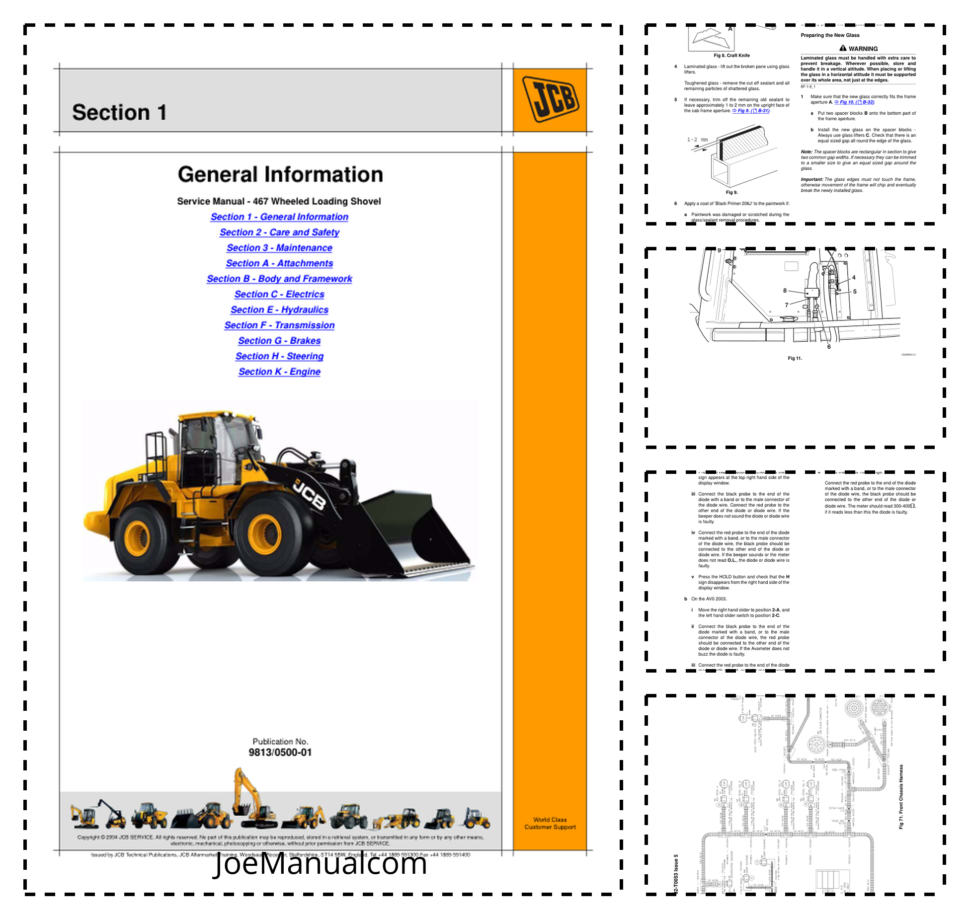 JCB 467 Wheeled Loading Shovel Service Manual 9813/0500-01 This service manual is a comprehensive resource designed for the maintenance and repair of the JCB 467 Wheeled Loading Shovel. It provides detailed technical specifications, operational guidelines, and step-by-step procedures for routine inspections, component replacement, and system diagnostics. The manual includes illustrations and diagrams to aid in identifying parts and understanding the machine’s mechanical and hydraulic systems. It serves as an essential tool for operators, technicians, and service personnel to ensure optimal performance, safety, and longevity of the equipment. By following the instructions outlined in this manual, users can efficiently troubleshoot common issues, perform scheduled maintenance, and maintain the shovel in accordance with manufacturer standards. The document is organized for easy reference, covering everything from initial setup to advanced servicing techniques, making it a valuable asset for anyone responsible for the upkeep of this heavy machinery unit.