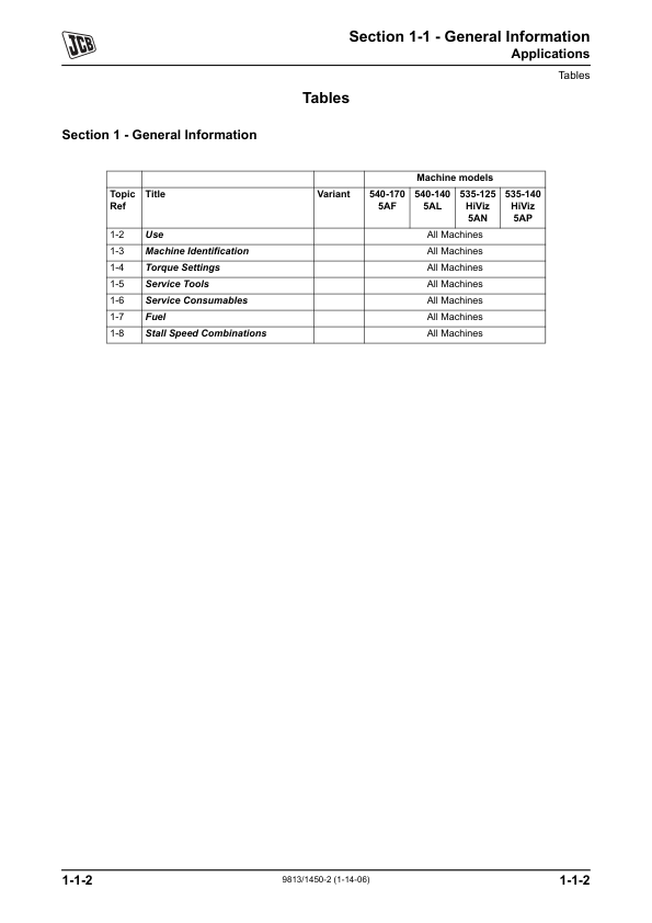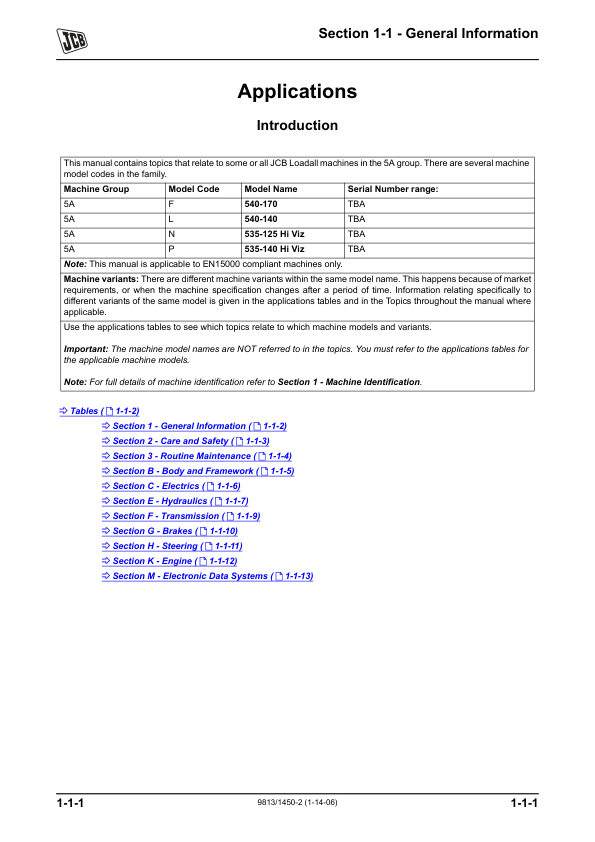 JCB 540-170 540-140 535-125 Hi Viz 535-140 Hi Viz 5 A Telehandlers Loadall Service Manual 9813/1450 This service manual is a comprehensive guide designed for the maintenance and repair of JCB telehandlers and loadall models including the 540-170, 540-140, 535-125, Hi Viz 535-140, and Hi Viz 5. It provides detailed technical specifications, operational instructions, troubleshooting procedures, and maintenance guidelines to ensure optimal performance and longevity of the equipment. The manual includes diagrams, schematics, and step-by-step guidance for routine servicing, component replacement, and system diagnostics, making it an essential resource for technicians and operators. It is structured to facilitate easy access to information while maintaining the integrity and safety standards required for heavy machinery operation.