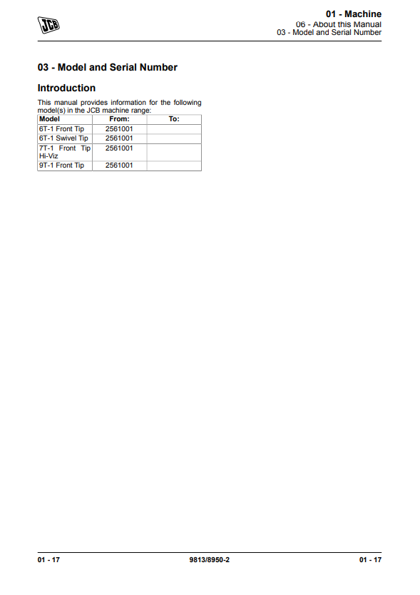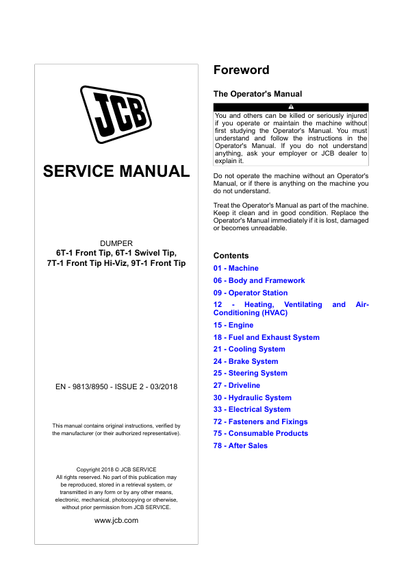 JCB 6T-1 7T-1 9T-1 Dumper Service Manual 9813/8950