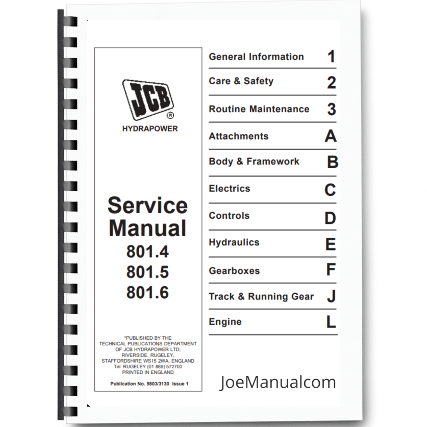 The JCB 801.4, 801.5, 801.6 Mini Excavator Service Manual is a detailed technical guide designed for the repair, maintenance, and servicing of these specific JCB mini excavator models. It covers essential systems, including the engine, hydraulics, transmission, and electrical components. The manual provides step-by-step repair procedures, troubleshooting tips, technical diagrams, and specifications to help technicians and mechanics perform accurate and efficient repairs. This service manual is a vital resource for maintaining the performance, reliability, and longevity of the JCB 801.4, 801.5, and 801.6 mini excavators.