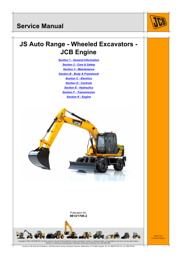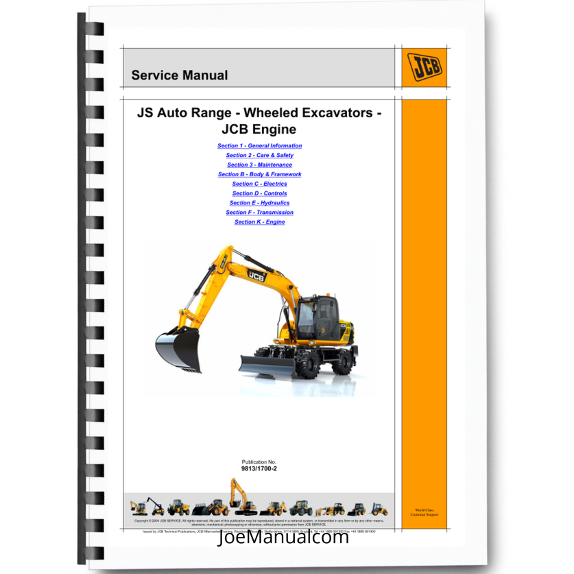 JCB JS Auto Range Wheeled Excavator with JCB Engine Service Manual 9813/1700-2 The JCB JS Auto Range Wheeled Excavator with JCB Engine Service Manual 9813/1700-2 is a robust and versatile piece of heavy machinery designed for demanding construction and earthmoving applications. This excavator combines advanced engineering with reliable performance, offering exceptional maneuverability and productivity on various job sites. The accompanying JCB Engine Service Manual 9813/1700-2 provides comprehensive guidance for maintenance, repair, and operational procedures, ensuring optimal functionality and longevity of the equipment. Built to withstand challenging environments, the machine features a durable chassis, efficient hydraulic systems, and precision-engineered components, making it an ideal choice for professionals seeking dependable performance and ease of serviceability. Its compact design and high lifting capacity enable efficient material handling, while the manual aids in troubleshooting and routine upkeep, supporting seamless operations across diverse projects.