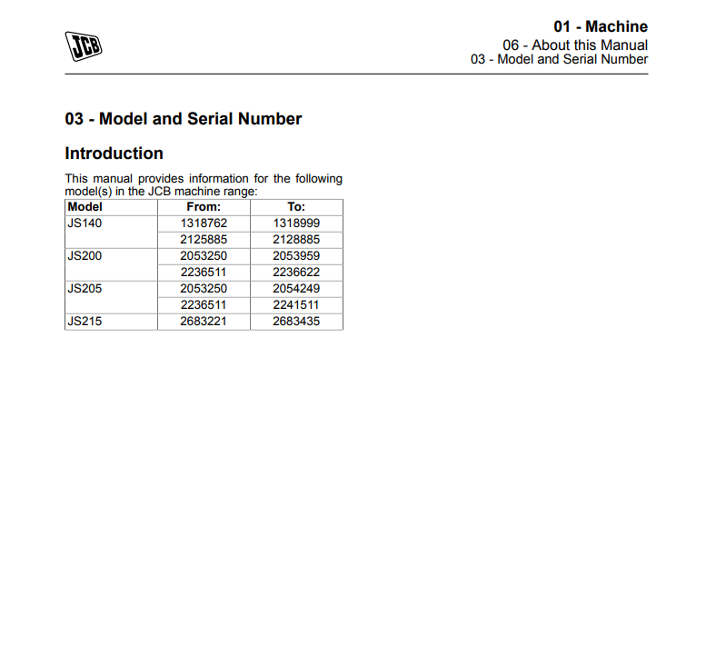 JCB JS140 JS200 JS205 JS215 Excavators Service Manual 9813/0400 This service manual provides detailed technical information and guidance for the maintenance repair and operation of JCB JS140 JS200 JS205 and JS215 excavators It includes comprehensive instructions for routine servicing troubleshooting and diagnosing common issues as well as specifications for parts replacement and system diagnostics The manual is designed to assist qualified technicians in ensuring optimal performance reliability and longevity of these heavy machinery models by offering step by step procedures and essential technical data for both engine hydraulic and mechanical systems It serves as a critical reference tool for maintaining compliance with manufacturer standards and safety protocols during all stages of equipment upkeep