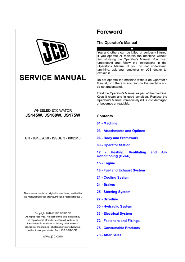 JCB JS145 W JS160 W JS175 W Wheeled Excavator Service Manual 9813/2650 The JCB JS145 W, JS160 W, and JS175 W Wheeled Excavator 9813/2650 series are engineered for versatility and performance in a wide range of construction and excavation tasks. Designed with advanced hydraulics and robust power systems, these machines offer exceptional mobility, enabling efficient operation on uneven or confined sites. Their compact yet powerful build ensures high productivity while maintaining stability and precision during digging, lifting, and material handling. Featuring user-friendly controls and durable components, they are ideal for both heavy-duty projects and smaller-scale applications, providing operators with reliable performance and adaptability to diverse working conditions.