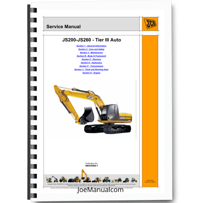 JCB JS200 JS220 JS235 JS240 JS260 Tier III Auto Excavator Service Manual 9803 6580. This comprehensive service manual provides detailed information for the maintenance, repair, and troubleshooting of JCB JS200, JS220, JS235, JS240, and JS260 Tier III automatic excavators. It includes technical specifications, diagnostic procedures, and step-by-step instructions to assist technicians in performing efficient and accurate servicing. The manual is essential for anyone working on these specific JCB excavator models.
