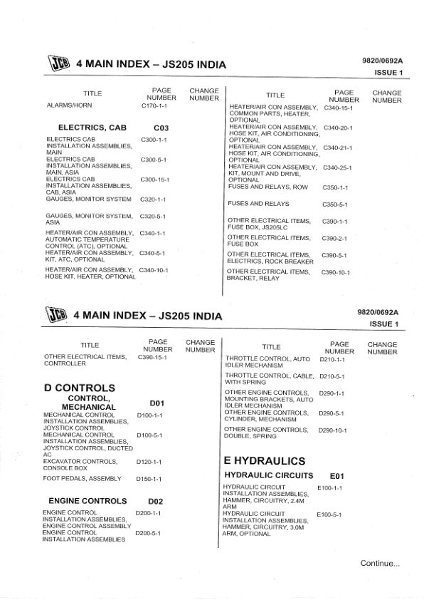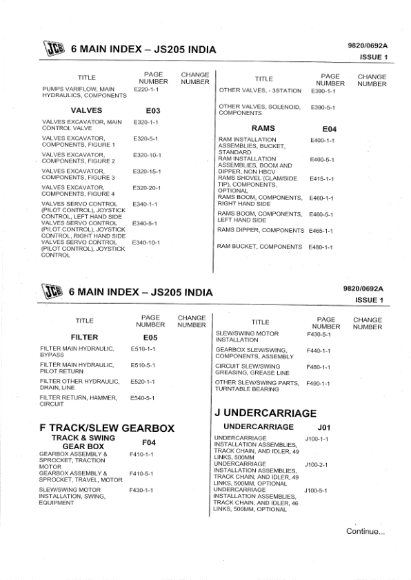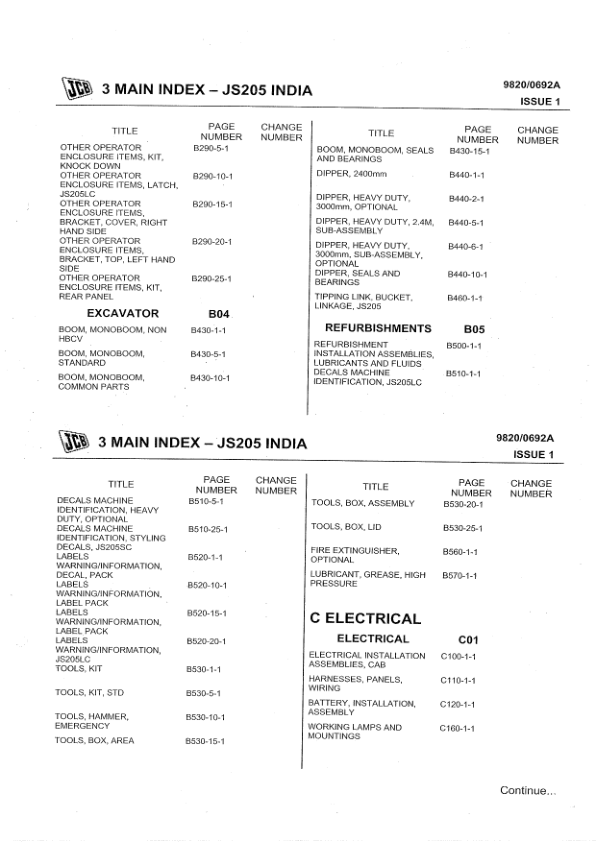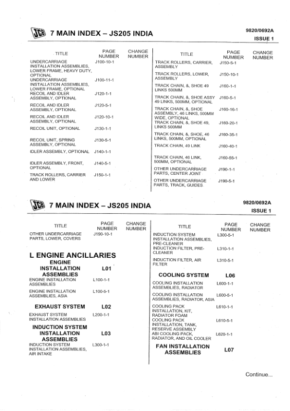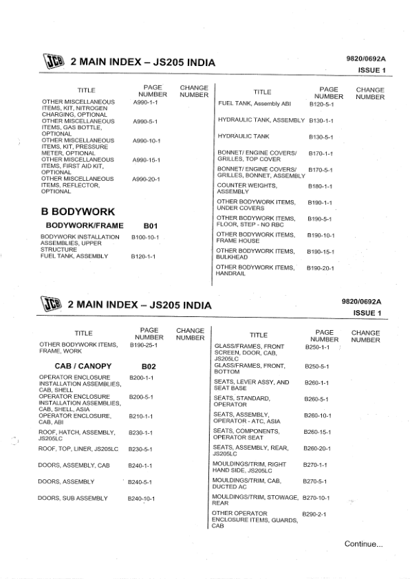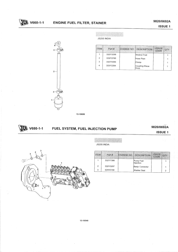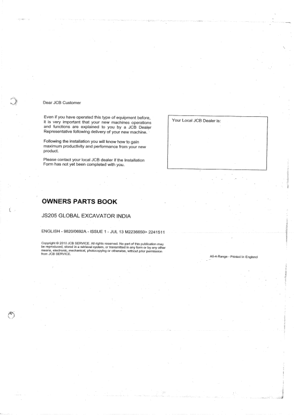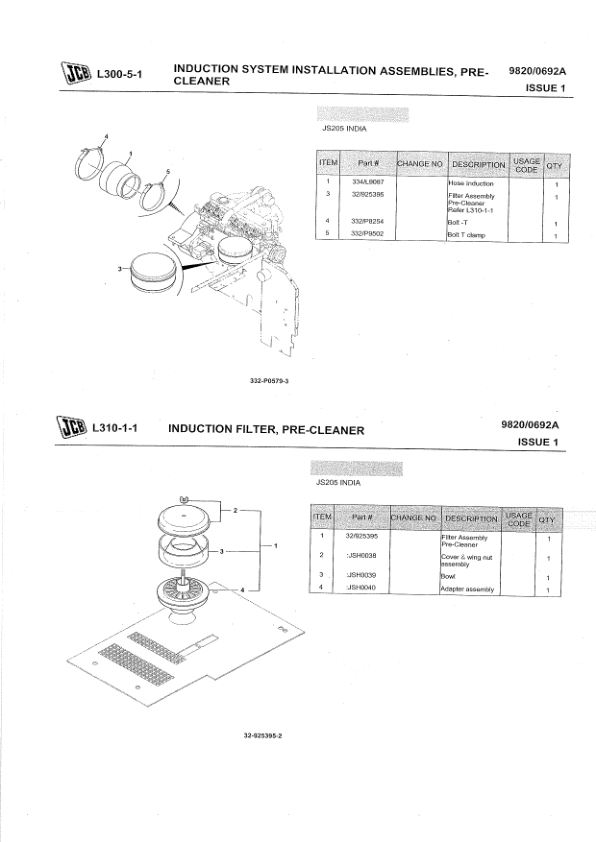 JCB JS205 Excavator Parts Catalog 9820-0692A-1
