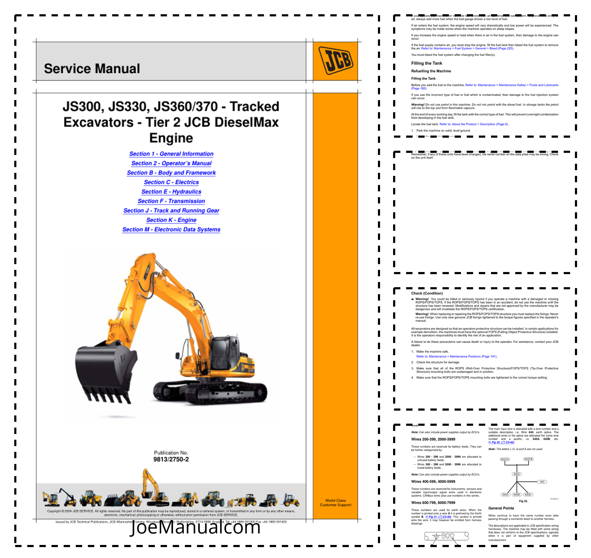 JCB JS300 JS330 JS360 JS370 Excavators Tier 2 with Diesel Max Engine Service Manual 9813/2750-2 This service manual is a comprehensive guide designed for the maintenance and repair of JCB JS300, JS330, JS360, and JS370 excavators equipped with Tier 2 emissions compliant Diesel Max engines. It provides detailed technical information including system diagrams, operational procedures, troubleshooting guidance, and maintenance instructions to ensure optimal performance and reliability of the machinery. The manual is structured to support both on-site technicians and professional service personnel in diagnosing issues, performing routine inspections, and executing repairs efficiently. Its precise specifications and clear illustrations make it an essential tool for preserving equipment efficiency while adhering to environmental regulations.