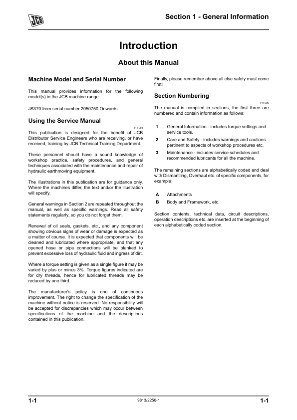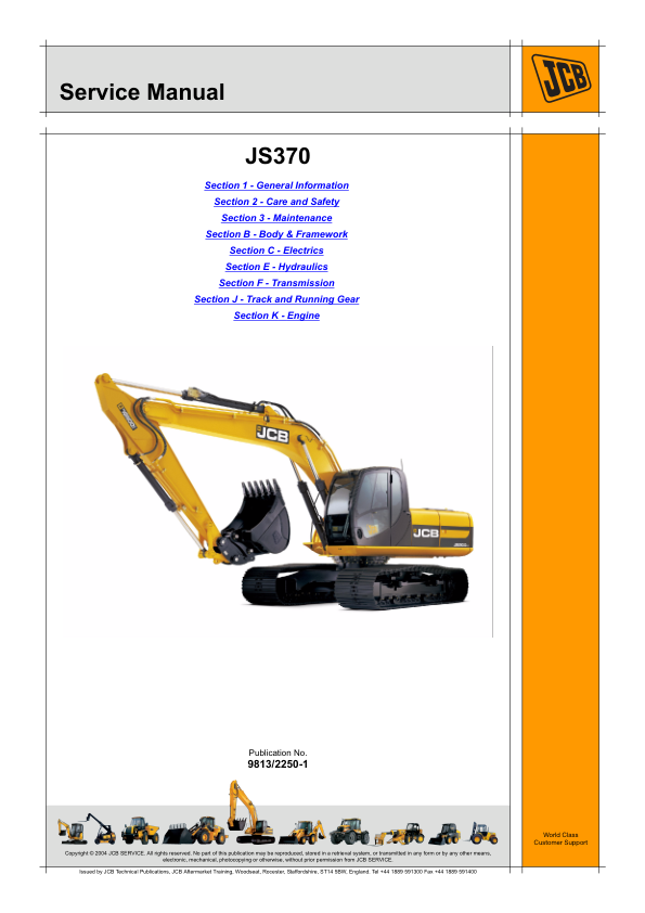 JCB JS370 Excavator Service Manual 9813/2250-1 This service manual is a comprehensive guide designed for the maintenance and repair of the JCB JS370 excavator model 9813/2250-1. It provides detailed information on the equipment’s technical specifications, operational procedures, and troubleshooting techniques to ensure optimal performance and longevity. The manual includes step-by-step instructions for routine servicing, parts identification, and system diagnostics, making it an essential resource for operators, technicians, and maintenance personnel. With its structured approach and accurate technical data, this manual supports efficient repair processes and helps maintain the excavator’s reliability in demanding construction environments.