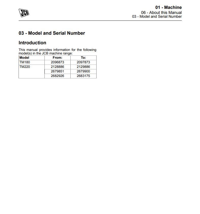 JCB TM180 TM220 Loader Service Manual 9813/3150 This service manual is a comprehensive guide designed for the maintenance, repair, and operation of JCB TM180 and TM220 loaders with model numbers 9813 and 3150. It provides detailed technical specifications, troubleshooting procedures, and step-by-step service instructions to ensure optimal performance and longevity of the equipment. The manual includes information on engine maintenance, hydraulic systems, electrical components, and mechanical assemblies, making it an essential resource for technicians and operators. It also covers routine inspections, adjustments, and parts replacement to support efficient servicing and uptime. With clear diagrams and specifications, this manual facilitates accurate diagnosis and repair of common issues, helping users maintain the reliability and efficiency of their JCB loaders.