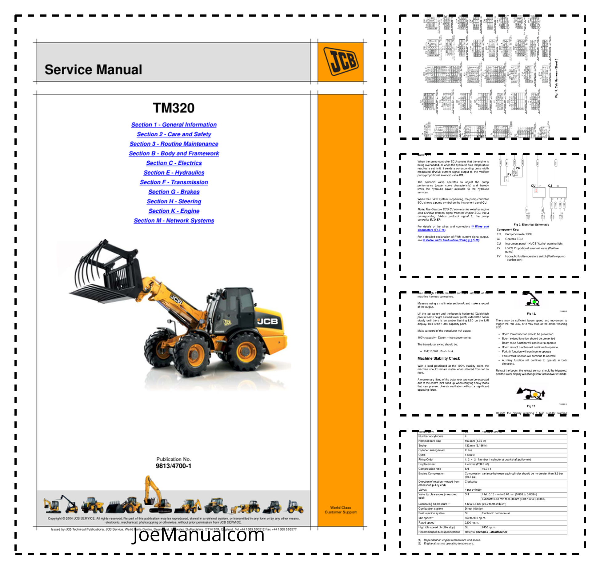 JCB TM320 Telescopic Loader Service Manual 9813/4700-1 This service manual is a comprehensive guide designed for maintenance and repair technicians working on the JCB TM320 Telescopic Loader. It provides detailed technical specifications, operational procedures, troubleshooting techniques, and repair instructions to ensure optimal performance and reliability of the equipment. The manual includes information on engine maintenance, hydraulic systems, electrical components, and mechanical assemblies, offering step-by-step guidance for routine servicing and complex diagnostics. It is an essential resource for operators and service personnel to understand the machine’s functionality, perform timely interventions, and adhere to safety standards. The document is structured to support efficient troubleshooting, parts identification, and adherence to manufacturer guidelines, making it a valuable tool for extending the lifespan and efficiency of the JCB TM320 Telescopic Loader.