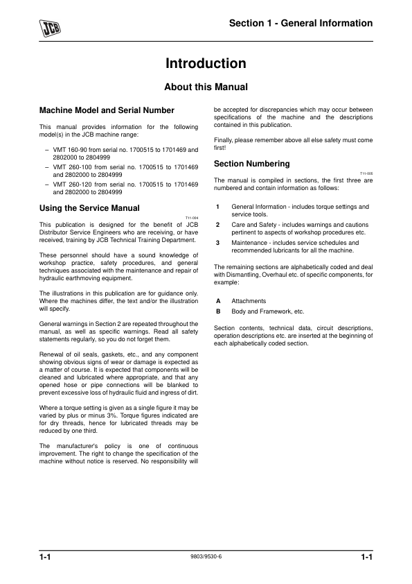 JCB VMT 160-90 260-100 260-120 Tier II Tier IV Roller Service Manual 9803/9530 This service manual is a comprehensive resource designed for the maintenance and operation of JCB VMT series rollers, including models 160-90, 260-100, and 260-120, compliant with Tier II and Tier IV emission standards. It provides detailed technical information essential for technicians and operators to perform routine maintenance, troubleshooting, and repairs. The manual covers specifications, system diagrams, component identification, operational procedures, and safety guidelines, ensuring adherence to manufacturer standards and regulatory requirements. It serves as a critical tool for maintaining optimal performance, extending equipment lifespan, and ensuring compliance with environmental regulations. The document includes maintenance schedules, diagnostic procedures, and parts lists, making it an invaluable reference for both field service and workshop applications.
