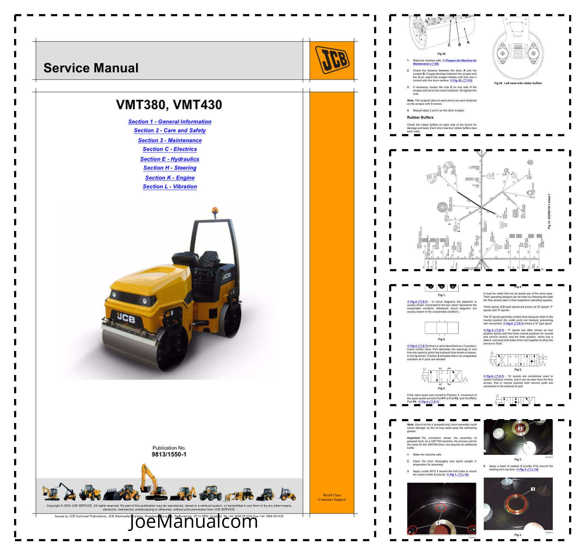 JCB VMT380 VMT430 Vibratory Roller Service Manual 9813/1550 This service manual provides detailed technical information and guidance for the maintenance, repair, and operation of the JCB VMT380 and VMT430 vibratory rollers. It includes comprehensive diagrams, specifications, and step-by-step procedures to assist technicians in diagnosing issues, performing routine inspections, and executing necessary repairs. The manual covers essential aspects such as engine systems, hydraulic components, vibration mechanisms, and electrical configurations, ensuring users have the knowledge to maintain optimal performance and efficiency of the equipment. It serves as a vital resource for both experienced and new technicians, offering clear instructions and safety protocols to support reliable operation and prolong the lifespan of the machines.
