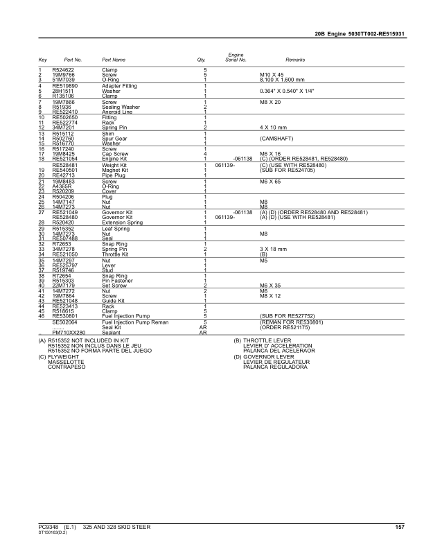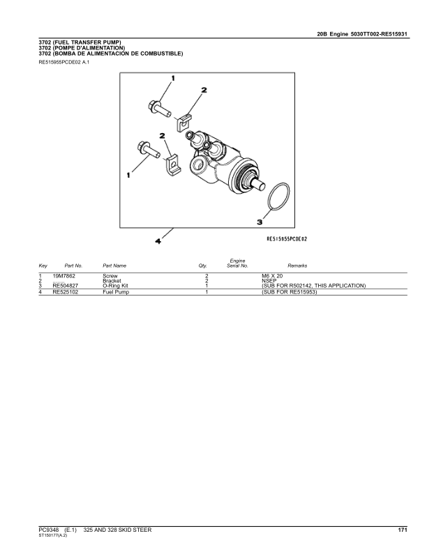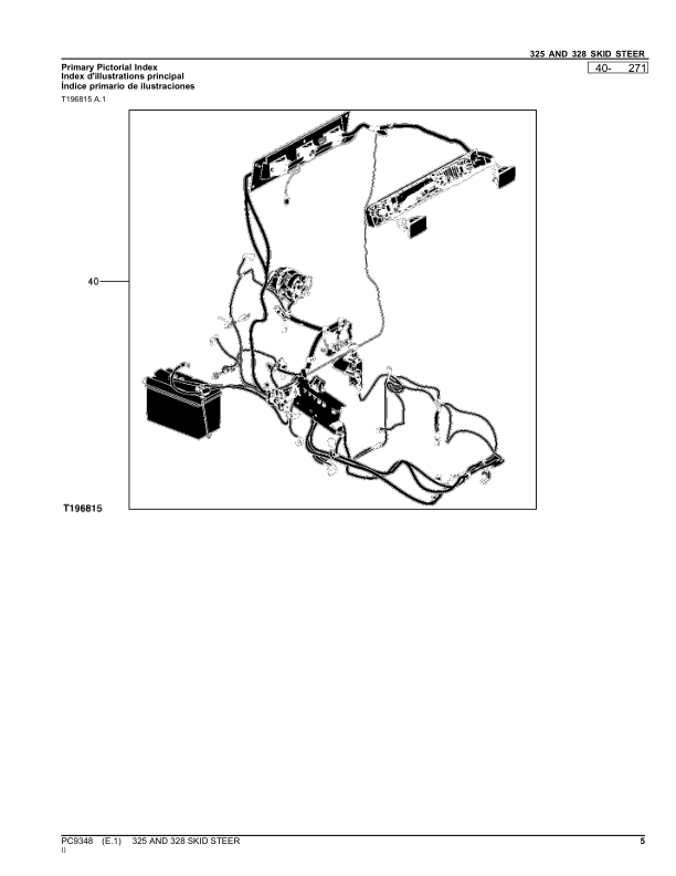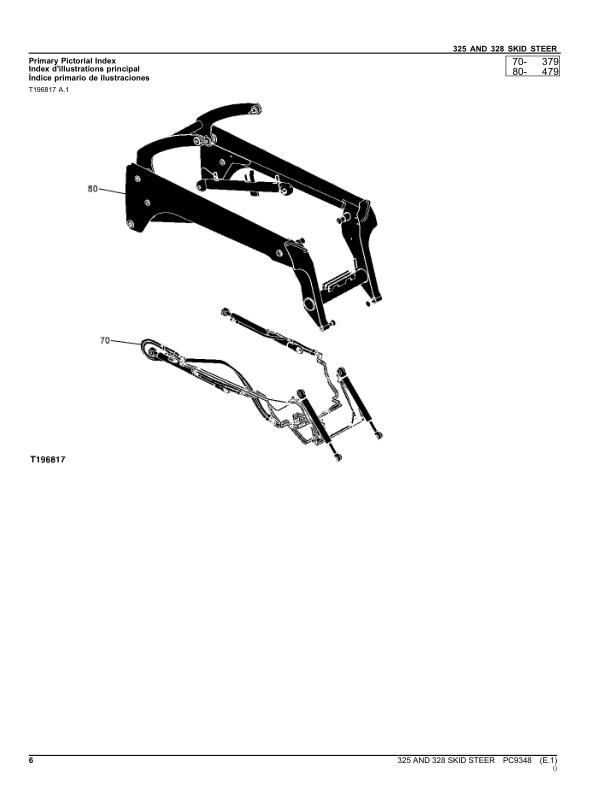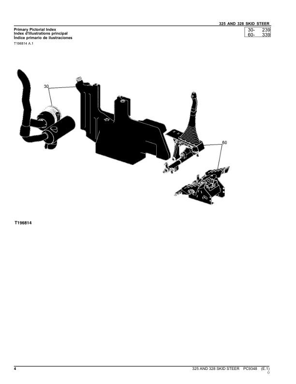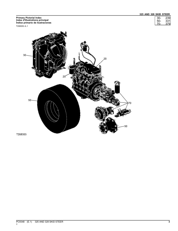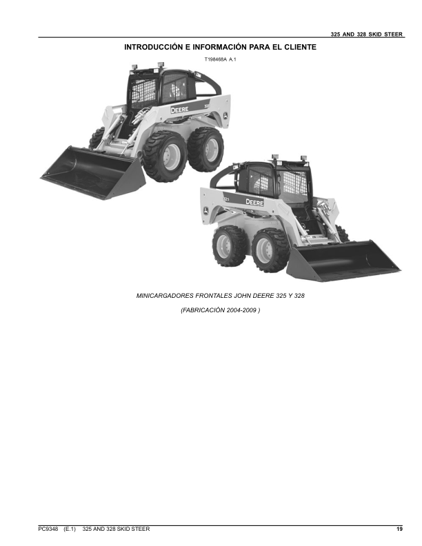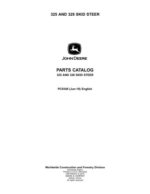 John Deere 325 328 Skid Steer Loader Parts Catalog PC9348 This comprehensive parts catalog is designed to provide detailed information for maintenance and repair of the John Deere 325 and 328 skid steer loaders. It includes accurate diagrams, part numbers, and specifications to help identify and locate components essential for routine servicing and troubleshooting. The catalog serves as a reliable reference for operators, technicians, and owners to ensure proper replacement and repair of parts while maintaining equipment performance and longevity. Its organized layout and precise details make it an invaluable tool for ensuring compatibility and efficiency during part installation or maintenance procedures.