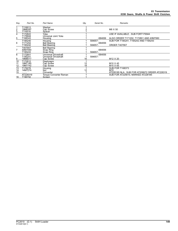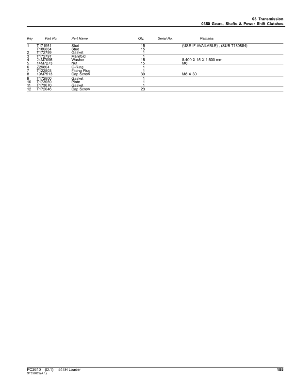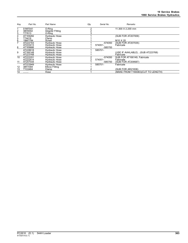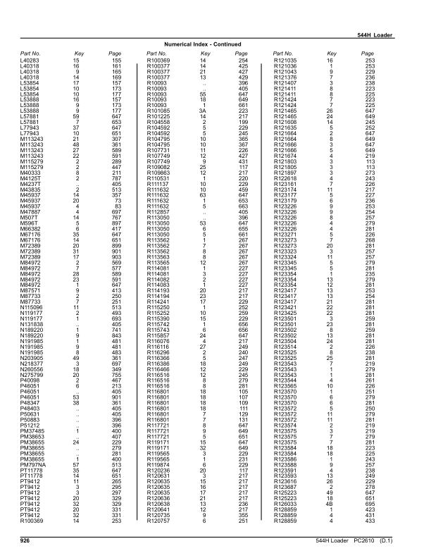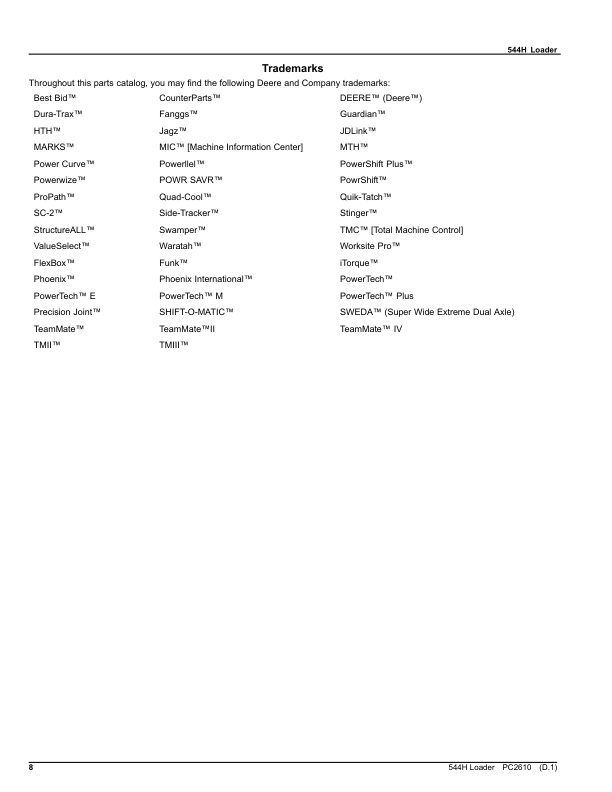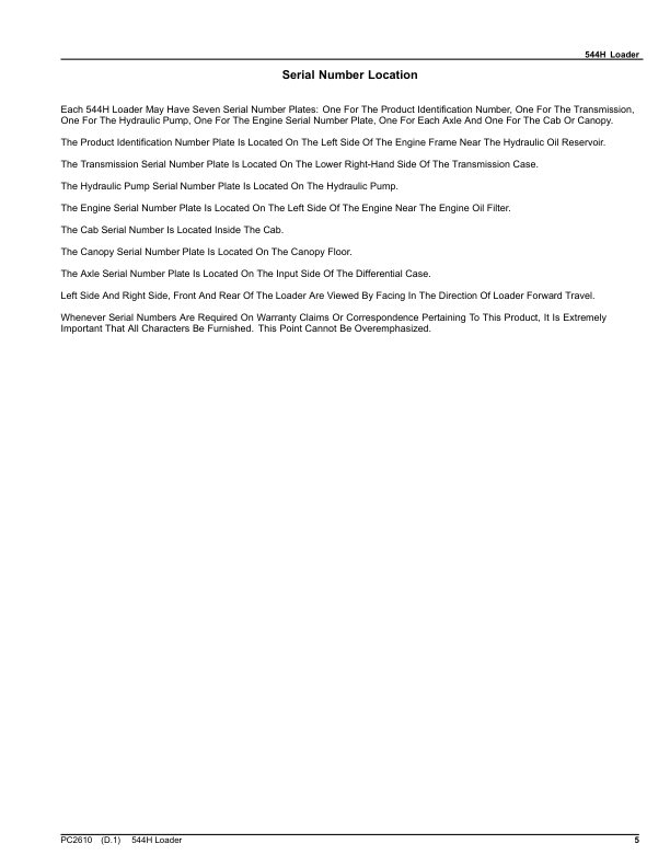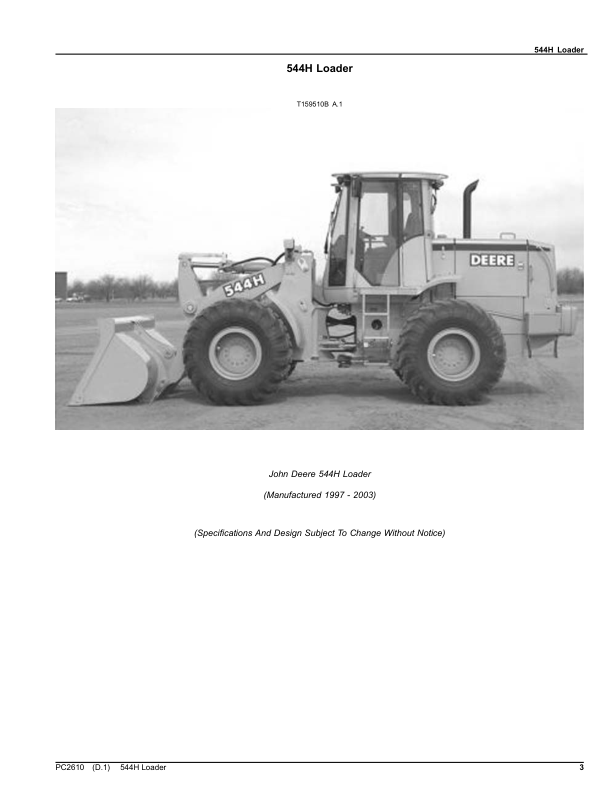 John Deere 544 H Wheel Loader Parts Catalog PC2610 The John Deere 544 H Wheel Loader Parts Catalog PC2610 is a detailed reference guide designed to assist with the identification, ordering, and installation of genuine parts for the John Deere 544 H wheel loader. This catalog provides comprehensive information on components such as hydraulics, engines, transmissions, and structural parts, ensuring accurate compatibility and specifications for maintenance and repair tasks. It serves as an essential tool for technicians and operators to streamline service procedures, enhance equipment reliability, and extend the lifespan of the machine. The catalog’s organized layout and precise illustrations make it easy to locate parts quickly, supporting efficient troubleshooting and part replacement. Its inclusion of part numbers, descriptions, and technical details ensures users can confidently source the correct components for their John Deere 544 H wheel loader.