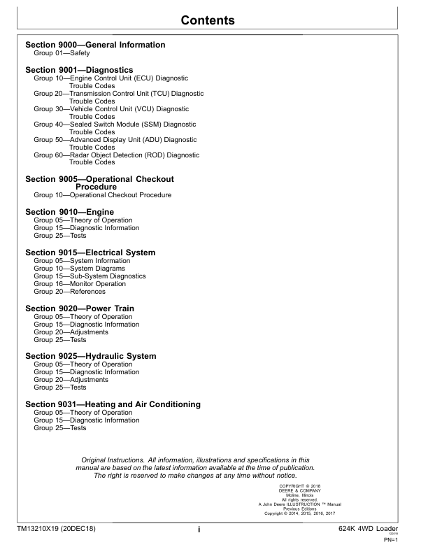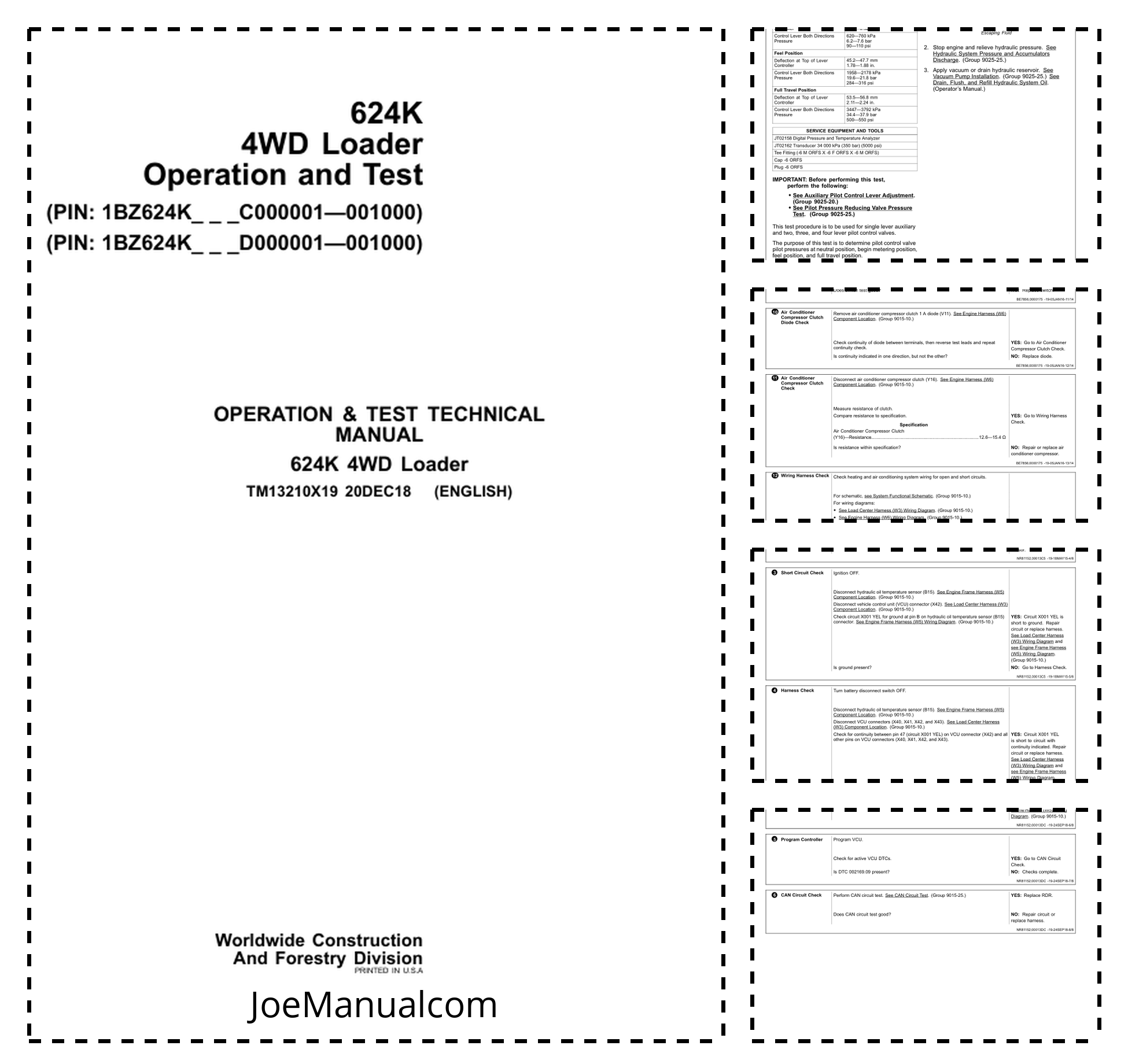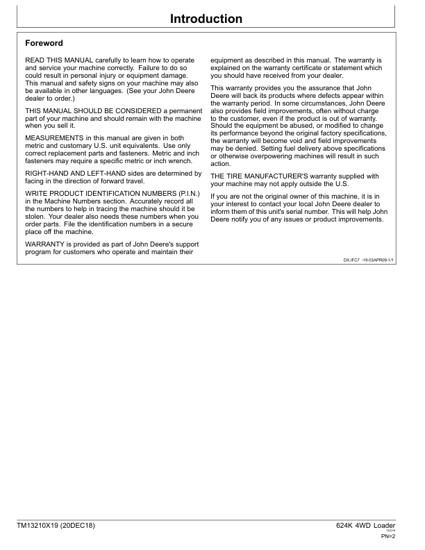 John Deere 624K 4WD Loader Operation and Test Technical Manual TM13210 X19 This comprehensive technical manual provides detailed guidance on the operation, maintenance, and testing procedures for the John Deere 624K  4WD Loader. It serves as an essential reference for operators and service personnel, covering key aspects such as system functions, performance checks, and diagnostic information. The manual includes step-by-step instructions for routine maintenance tasks, safety protocols, and troubleshooting common issues, ensuring users can effectively manage and service the equipment. Additionally, it outlines procedures for conducting operational tests to verify the loader’s functionality and compliance with specifications. Designed for technical accuracy and clarity, this document supports optimal performance, reliability, and safe handling of the John Deere 624K 4WD Loader.
