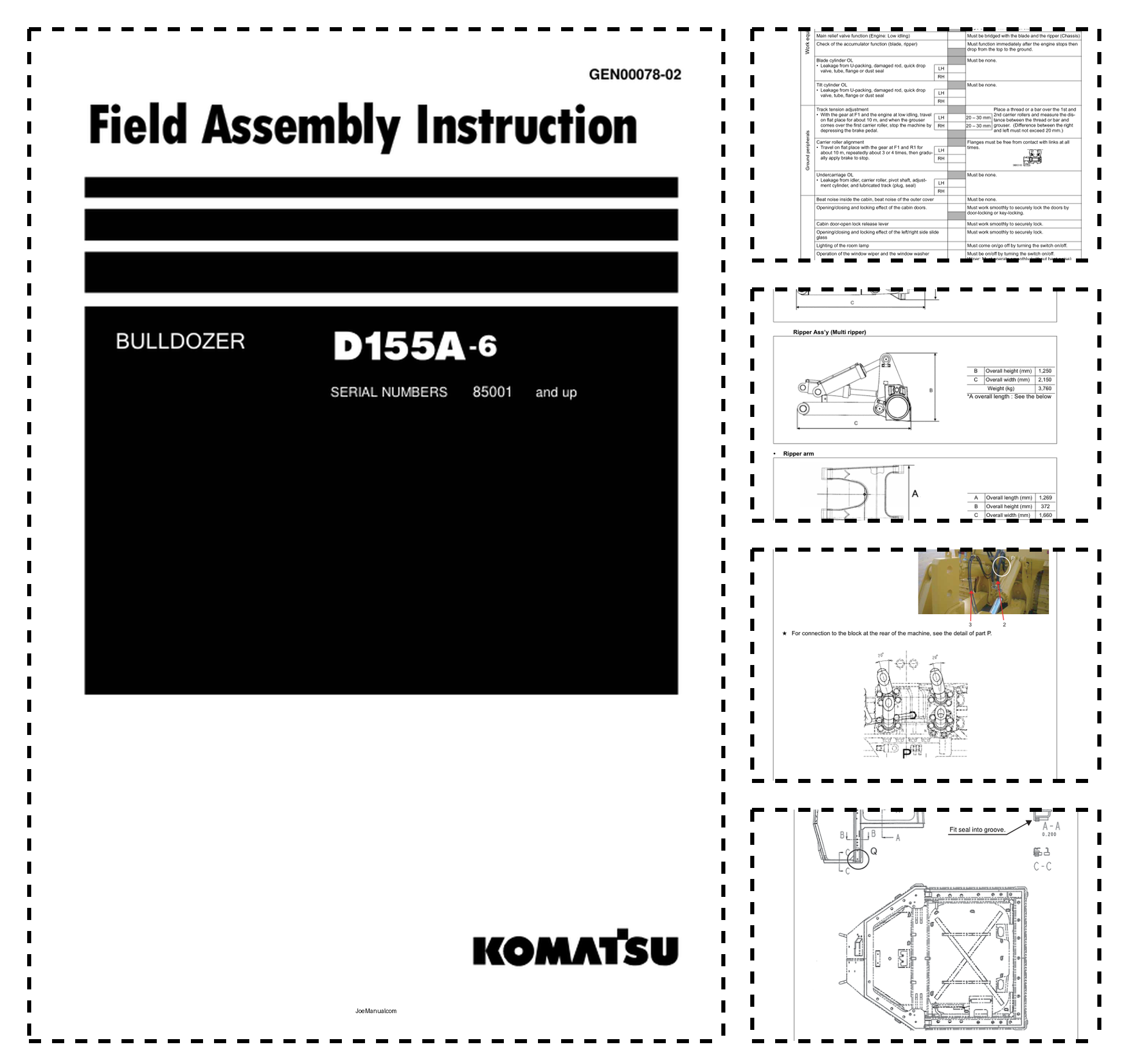 Komatsu D155A-6 Bulldozer Field Assembly Instruction SN 85001 and UP
