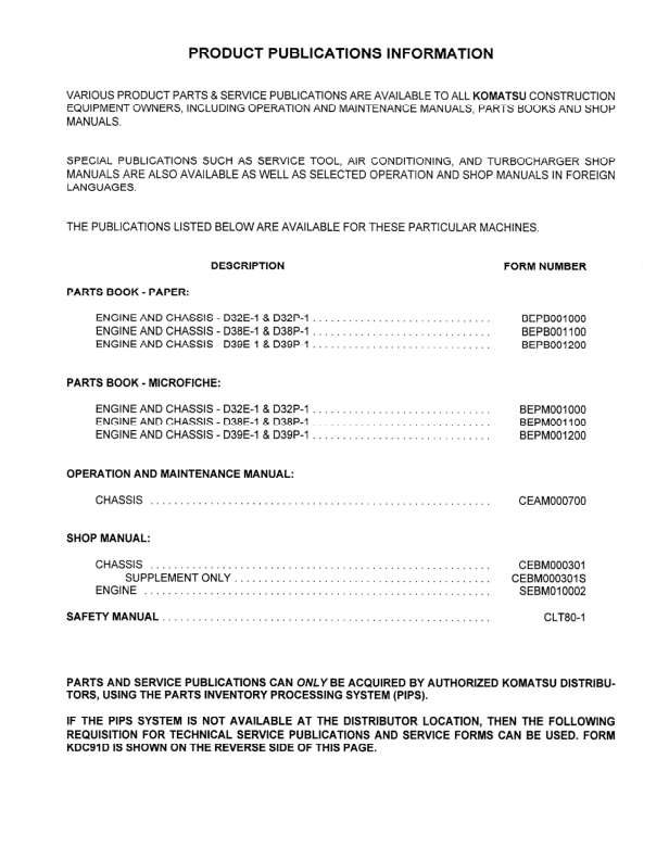 Komatsu D32E D38E D39E P-1 Bulldozer Workshop Manual