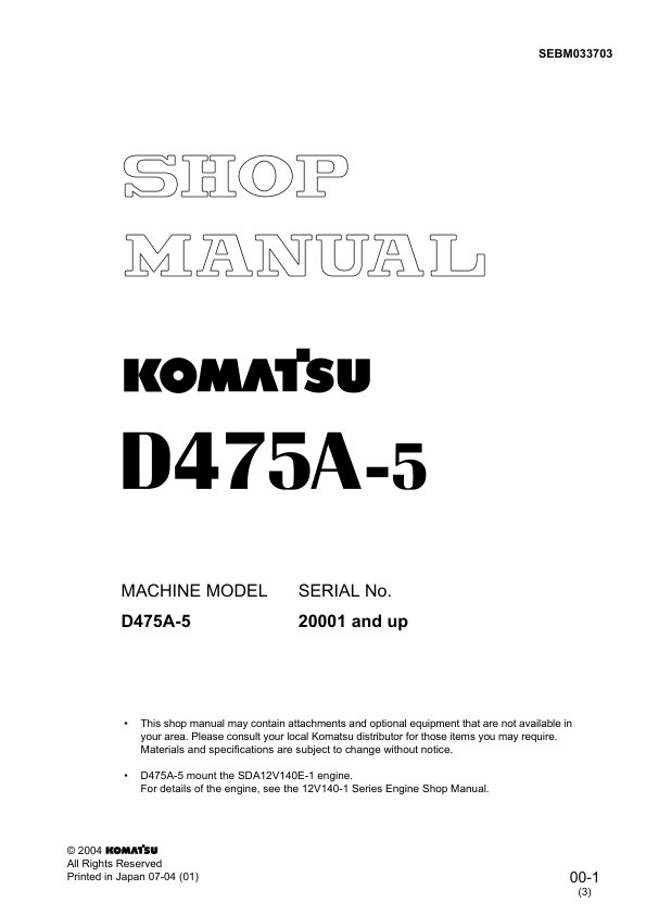 Komatsu D475A-5 Dozer Workshop Manual SN 20001 and UP