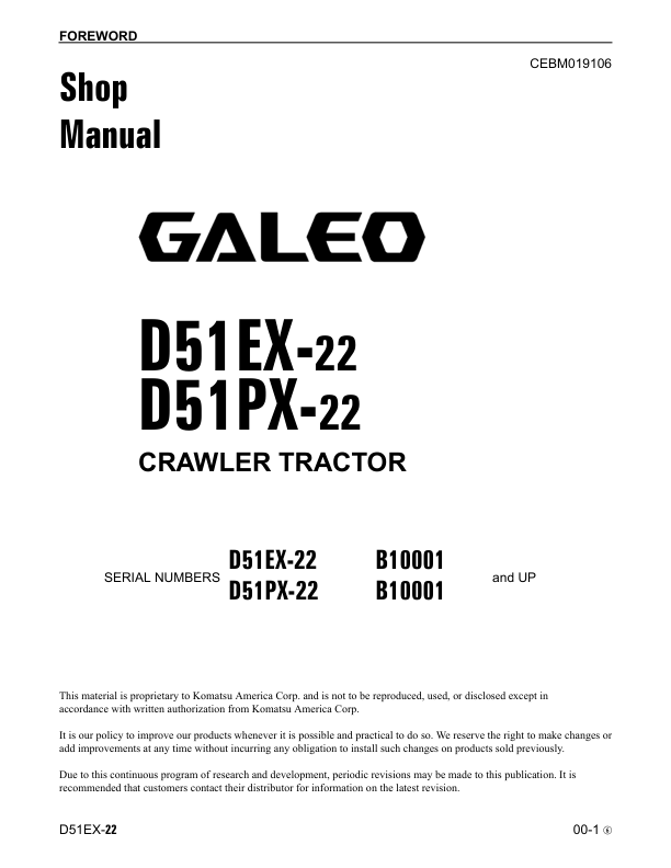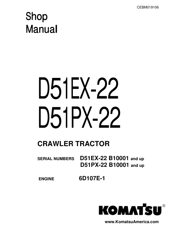 Komatsu D51EX-22 D51PX-22 Bulldozer Workshop Manual SN B10001 and UP