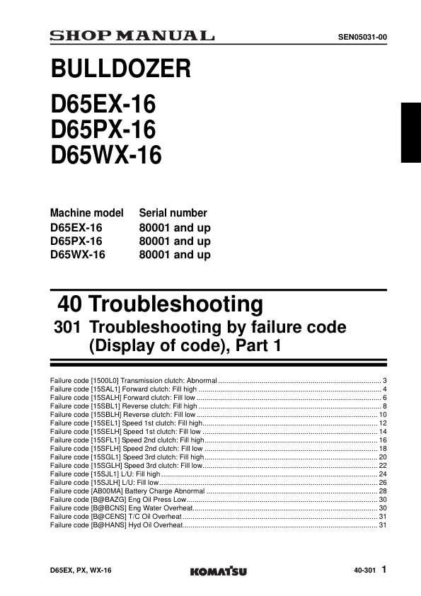 Komatsu D65EX-16 D65PX-16 D65WX-16 Bulldozer Workshop Manual SN 80001 and UP