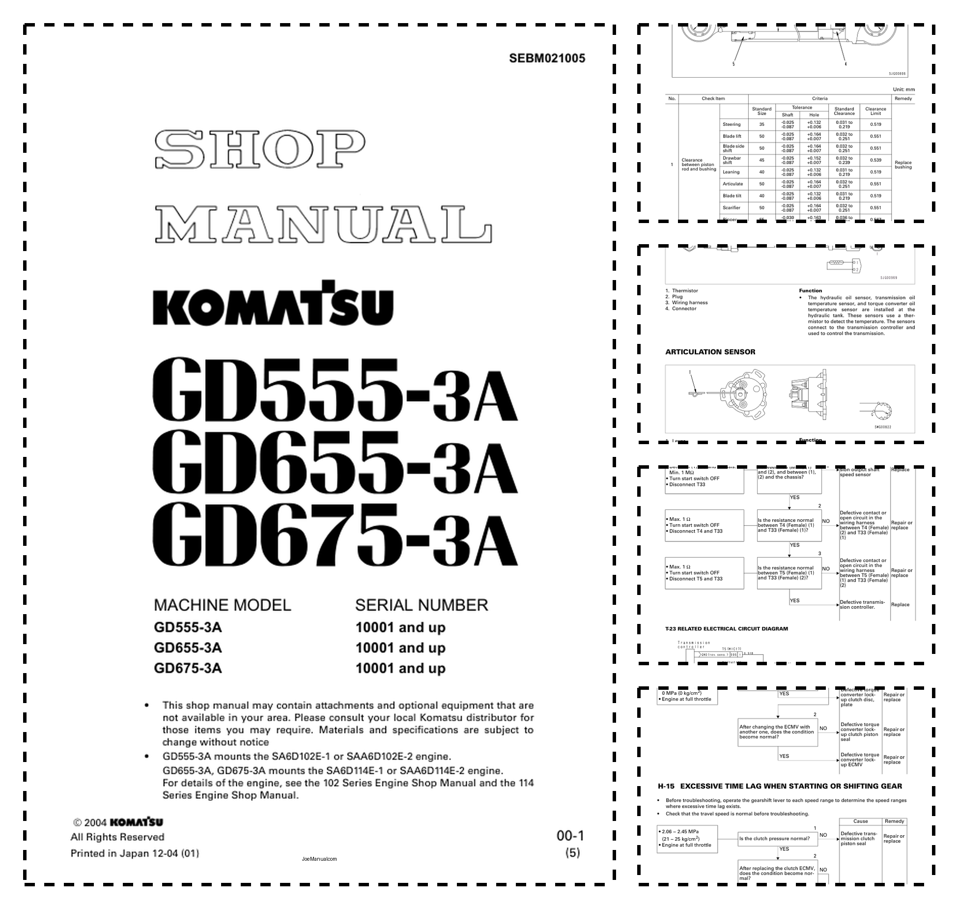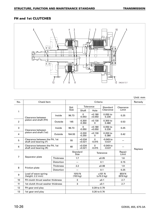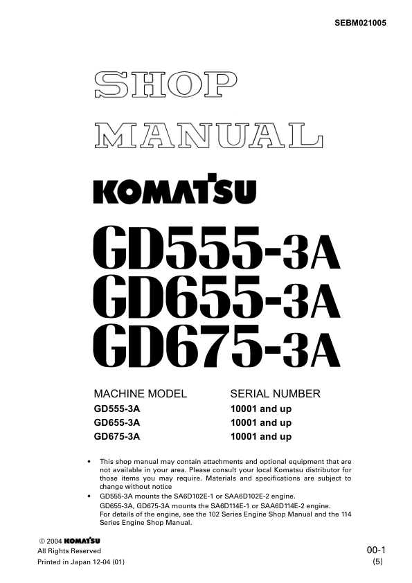 Komatsu GD555-3A GD655-3A GD675-3A Motor Grader Workshop Manual SN 10001 and UP v21005