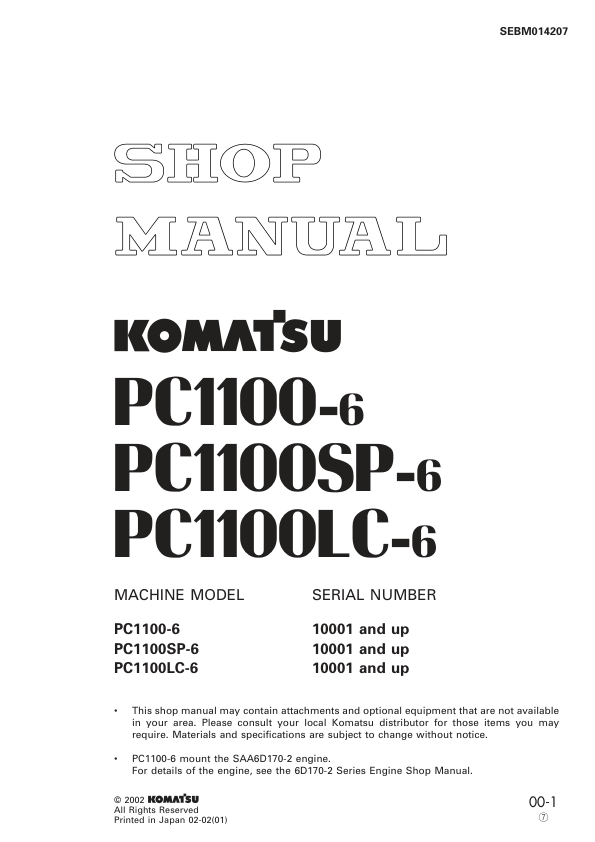 Komatsu PC1100-6 SP-6 LC-6 Excavator Workshop Manual SN 10001 and UP SEBM014207