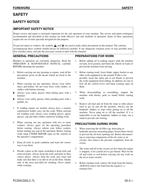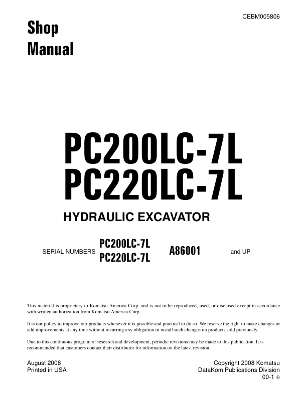 Komatsu PC200LC-7L PC220-7L Excavator Workshop Manual SN A86001 and UP
