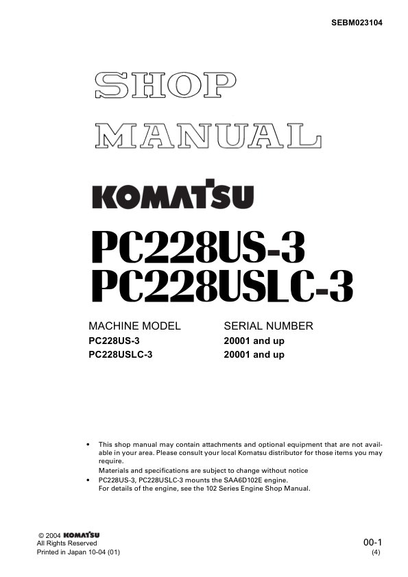 Komatsu PC228US-3 PC228USLC-3 Excavator Workshop Manual SN 20001 and UP