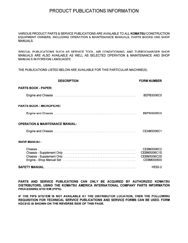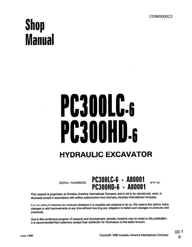 Komatsu PC300LC-6 PC300HD-6 Excavator Workshop Manual SN A80001 and UP CEBM30006C2