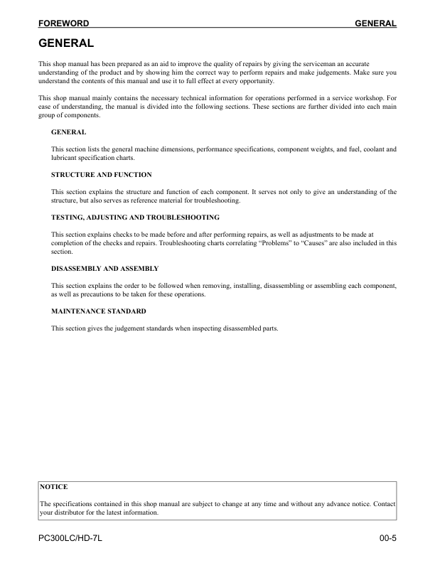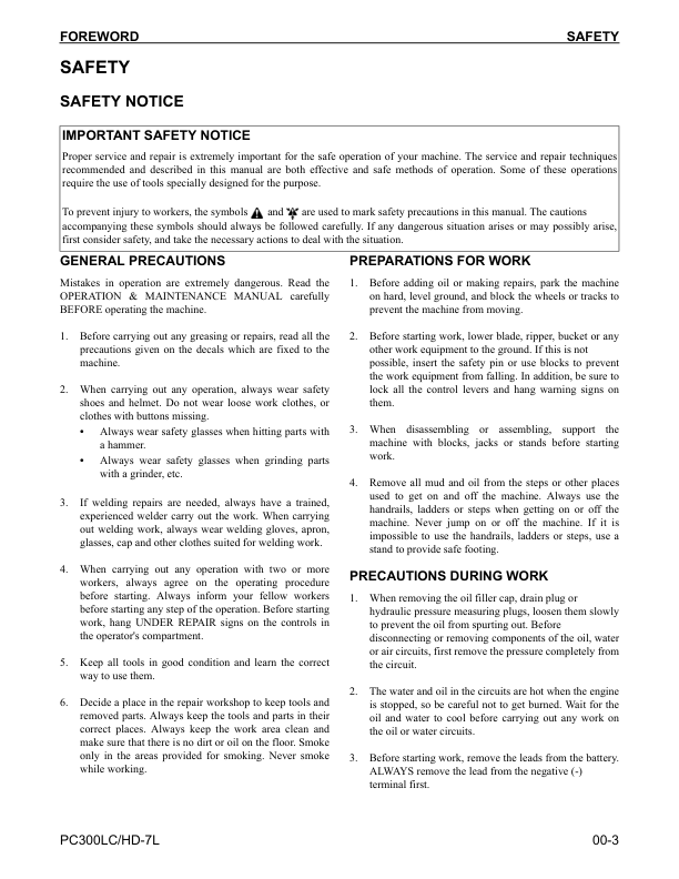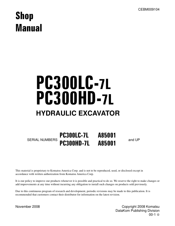 Komatsu PC300LC-7L PC300HD-7L Excavator Workshop Manual SN A85001 and UP