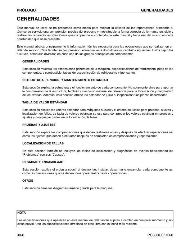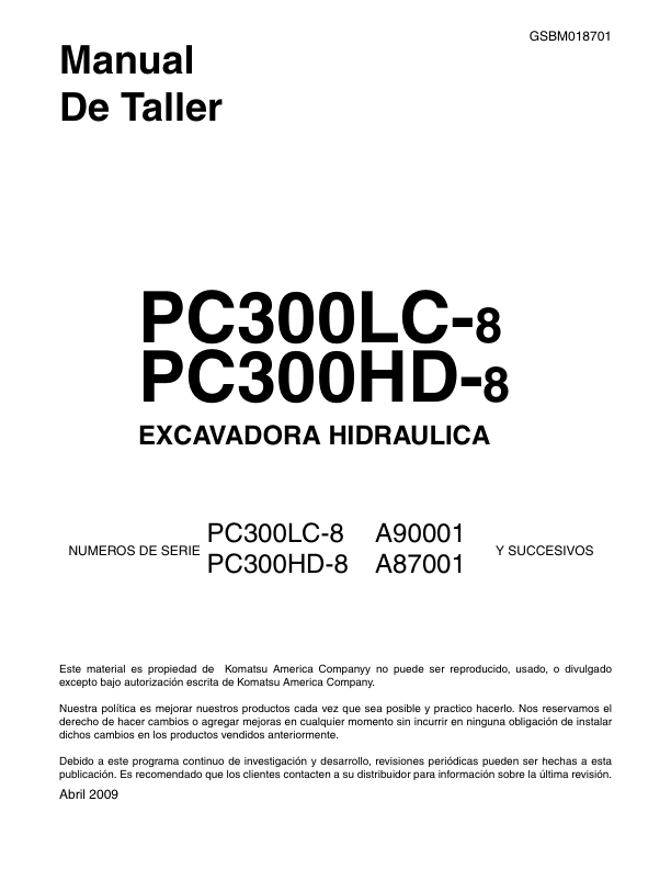 Komatsu PC300LC-8 PC300HD-8 Excavator Workshop Manual SN A90001 A87001 and UP GSBM018701