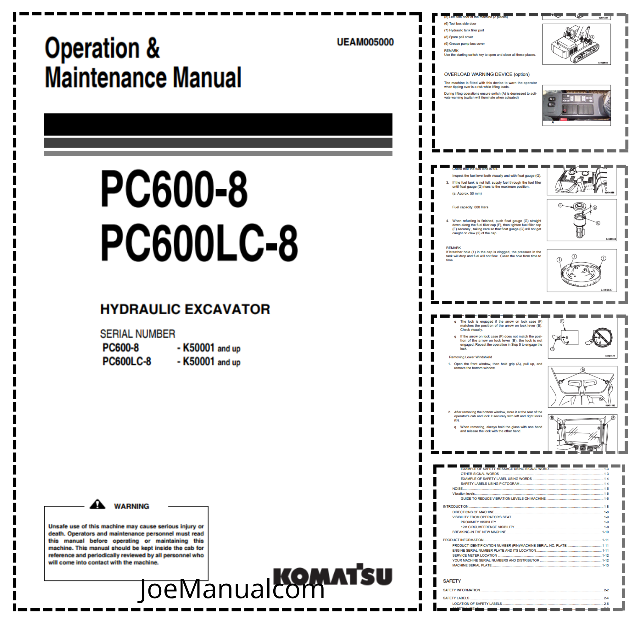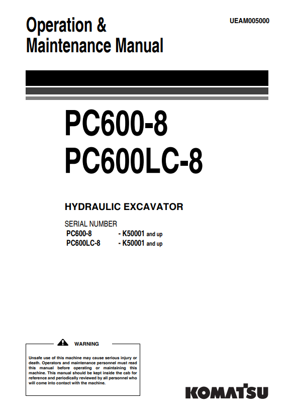 The Komatsu PC600-8 / PC600LC-8 Operation and Maintenance Manual is the official guide for the safe operation, daily maintenance, and service intervals of these hydraulic excavators. It includes: