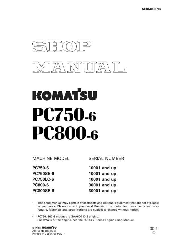 Komatsu PC750-6 PC800-6 Excavator Workshop Manual SN 10001 30001 and UP