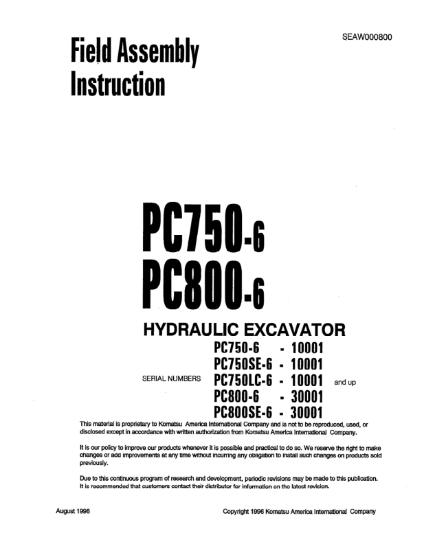 Komatsu PC750-6 SE-6 LC-6 PC800-6 SE-6 Excavator Workshop Manual SN 10001 30001 and UP