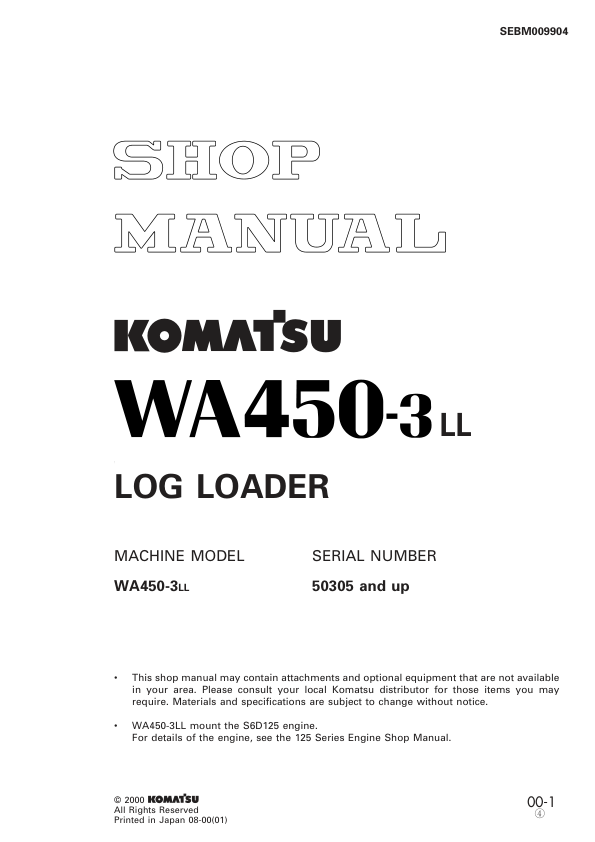 Komatsu WA450-3LL Wheel Loader Workshop Manual SN 50305 and UP