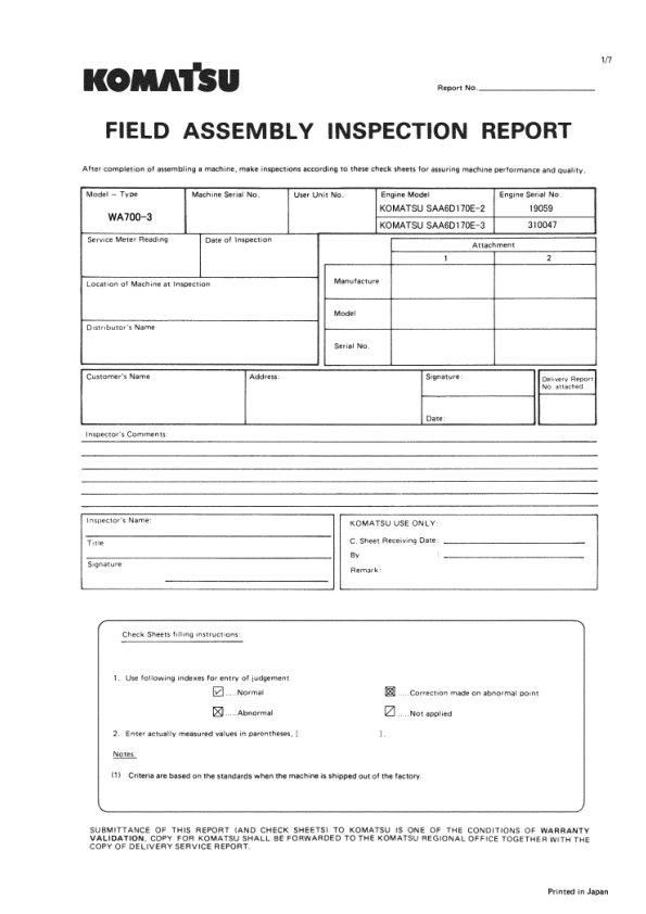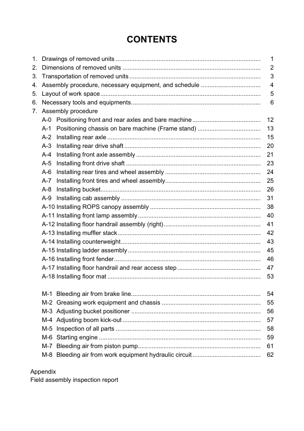 Komatsu WA700-3 Galeo Wheel Loader Field Assembly Instruction SN 50001 and UP