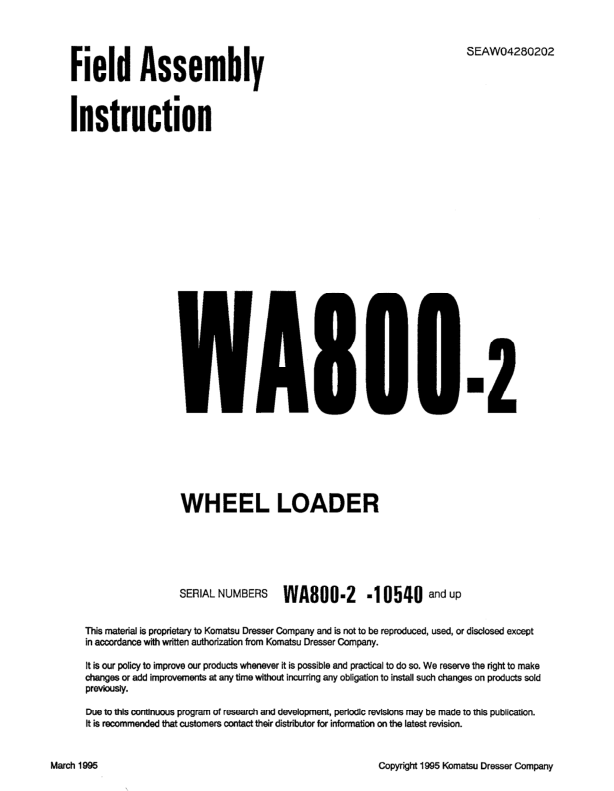 Komatsu WA800-2 Wheel Loader Field Assembly Instruction SN 10540 and UP