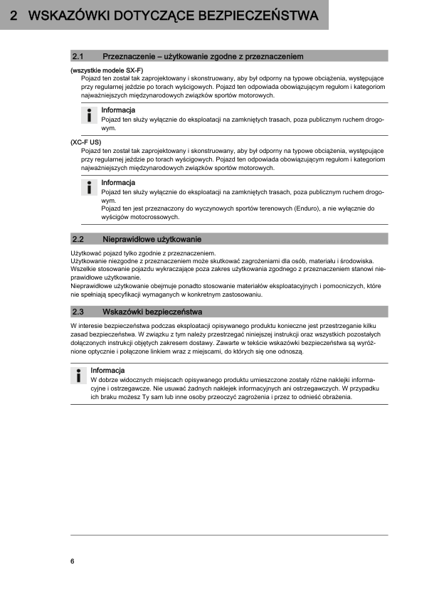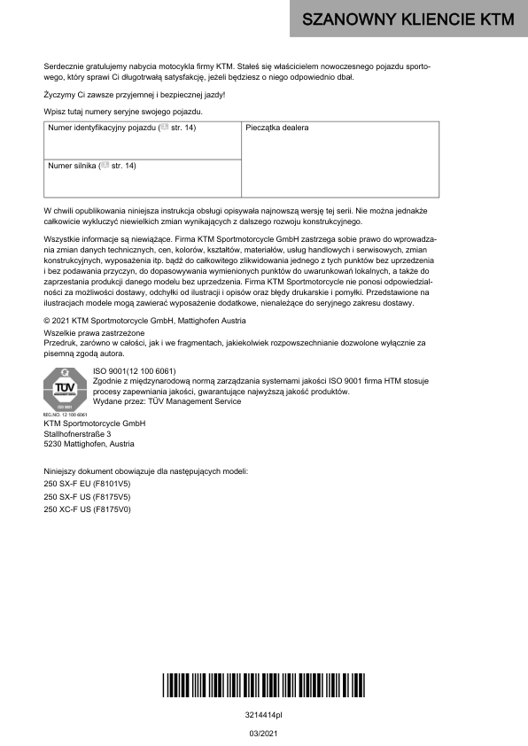 KTM 250 SX F 250 XC F Motorcycle Operators Manual PL