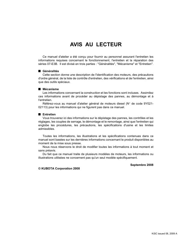 Kubota 07-E3B Serie Diesel Engine Workshop Manual FR