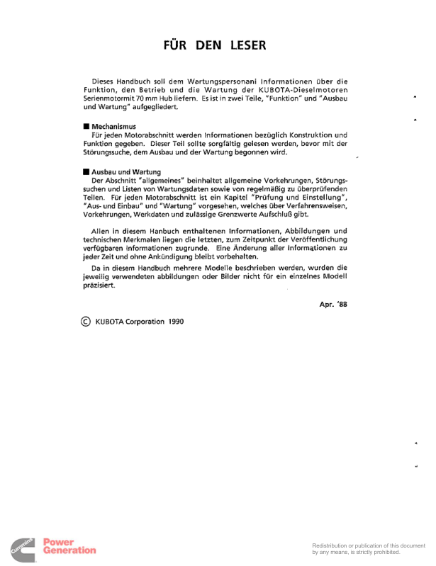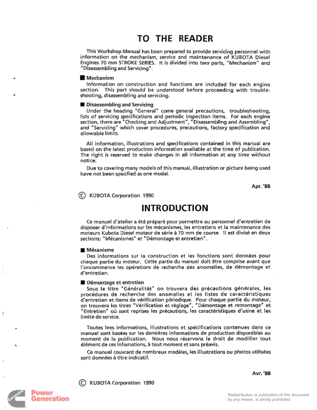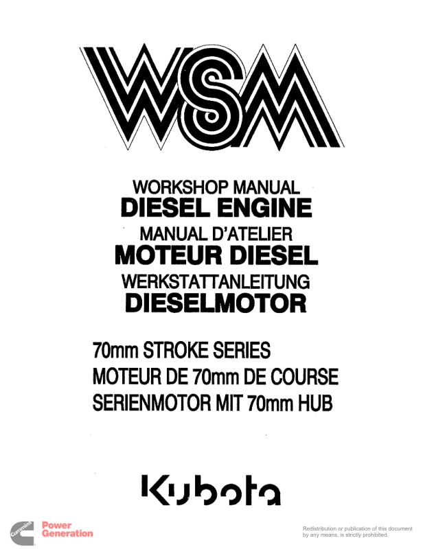 Kubota Diesel Engine 70 mm Stroke Series Workshop Manual