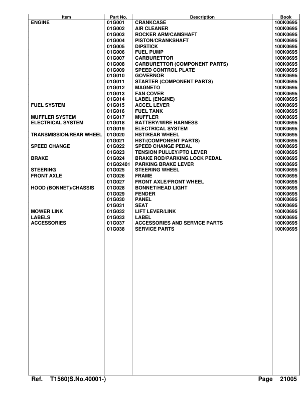 Kubota T1560 Lawn Tractor Parts Catalog Serial 40001 and Above