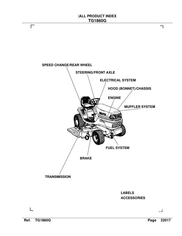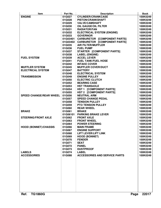 Kubota TG1860G Lawn Tractor Parts Catalog