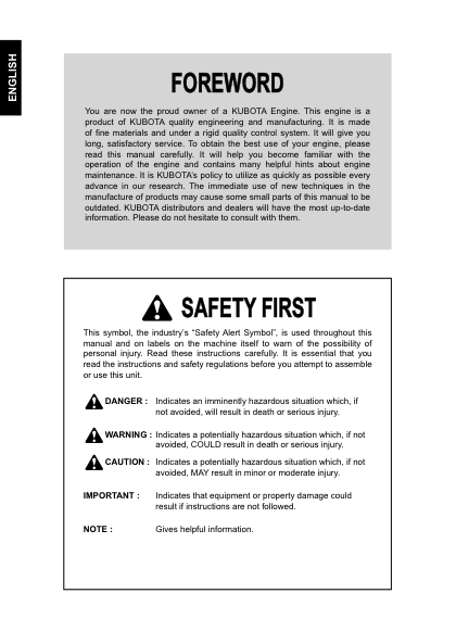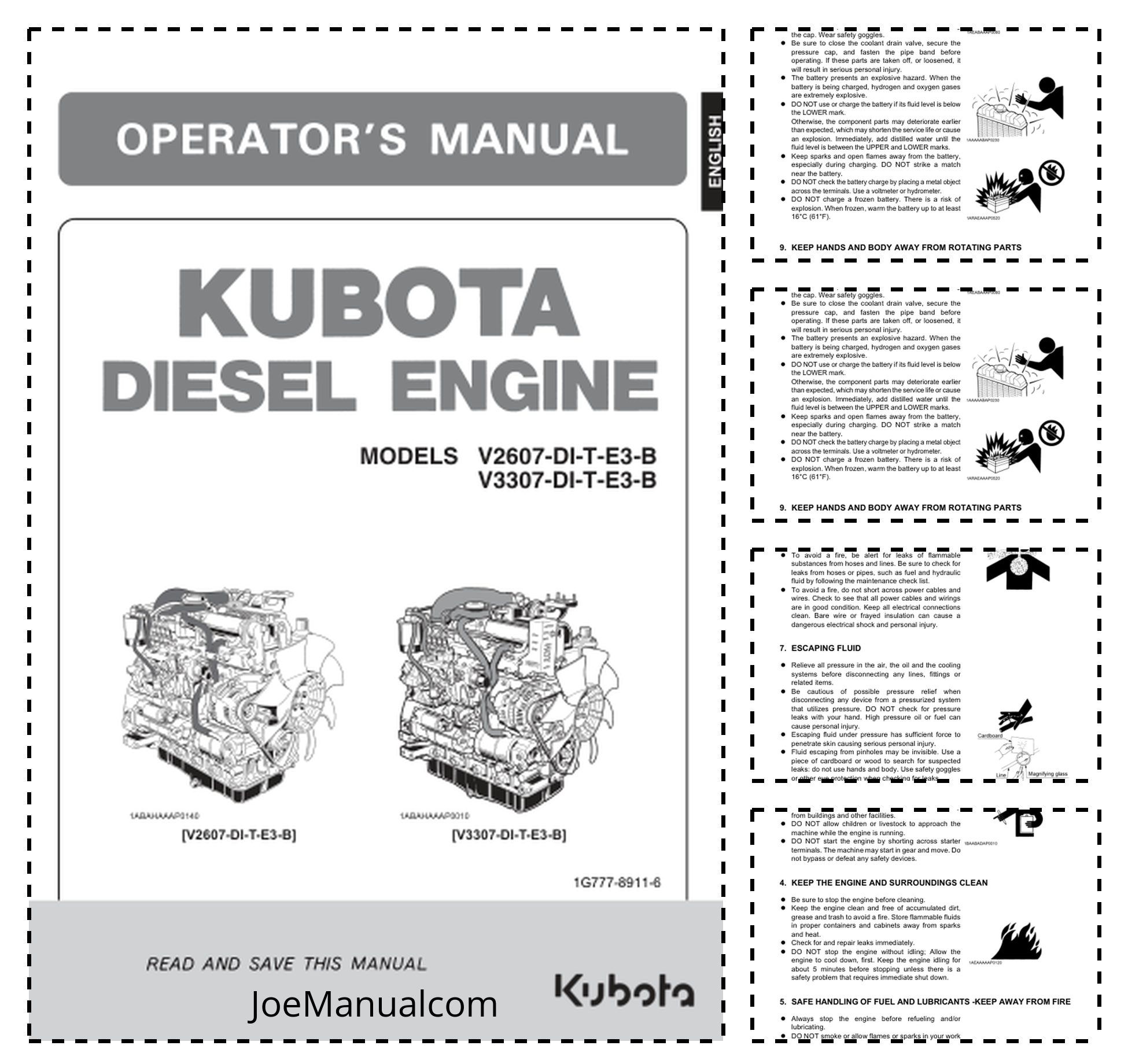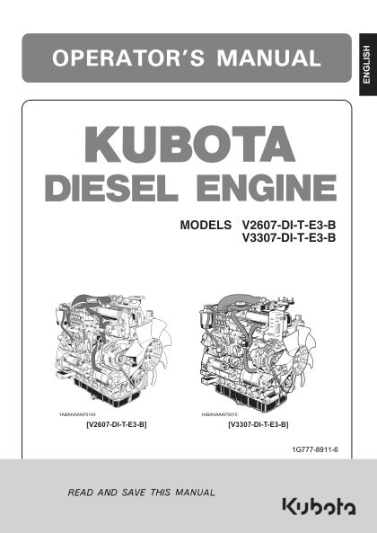Kubota V2607 V3307 DI T E3 B Diesel Engine Operators Manual. This manual provides essential information for the safe and efficient operation and maintenance of Kubota V2607 and V3307 DI T E3 B diesel engines. It includes detailed instructions, specifications, and troubleshooting guidance to help operators and technicians properly manage and service these engines.
