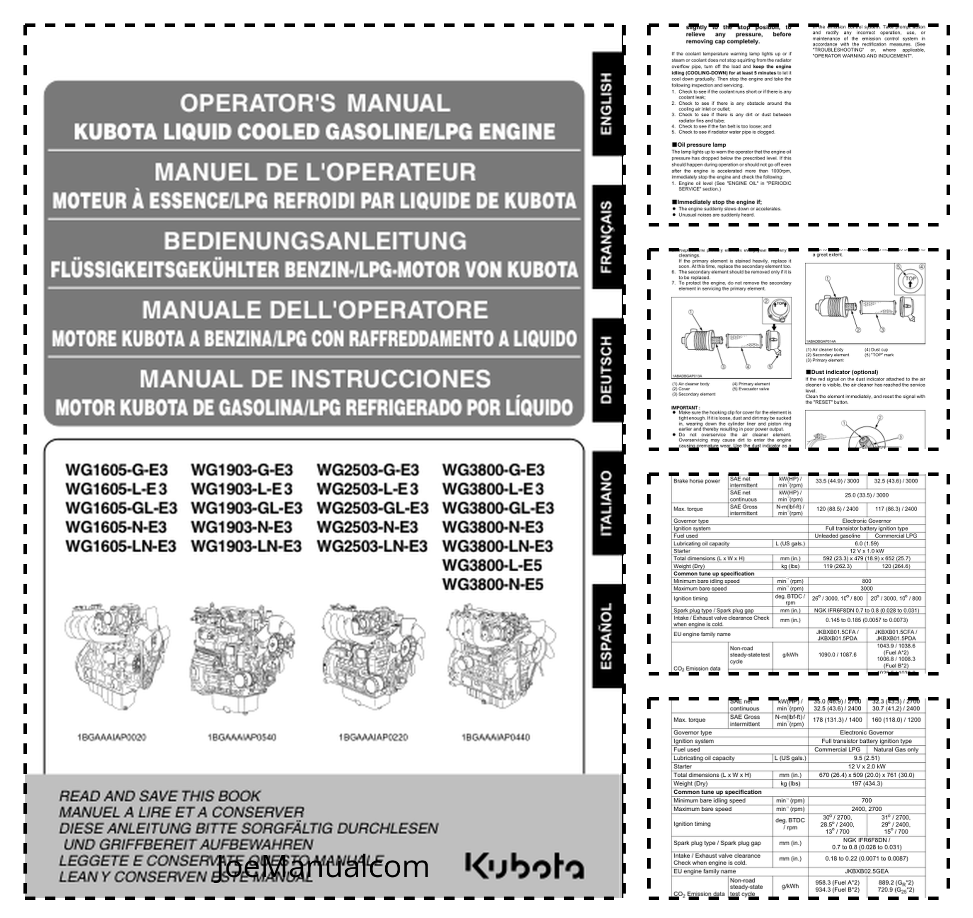 Kubota WG1605 WG1903 WG2503 WG3800 Engines Operators Manual
