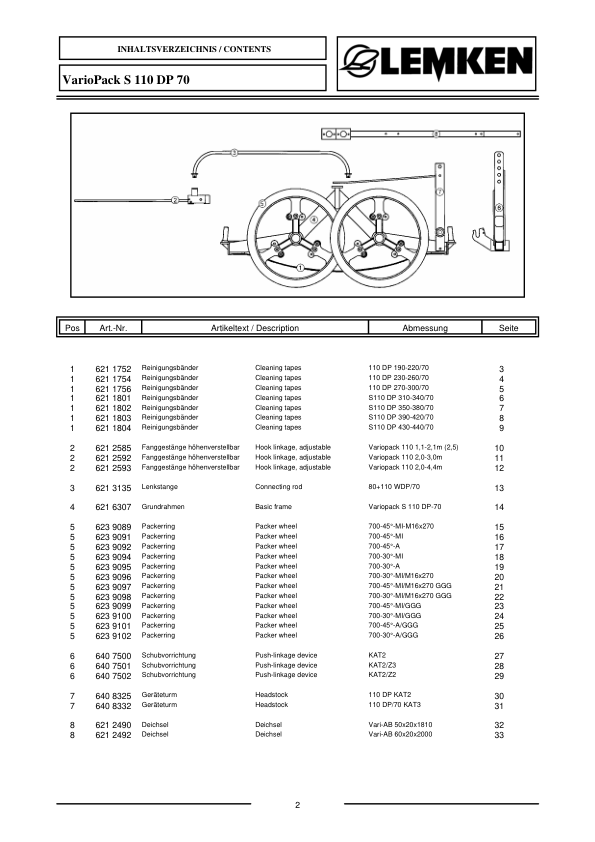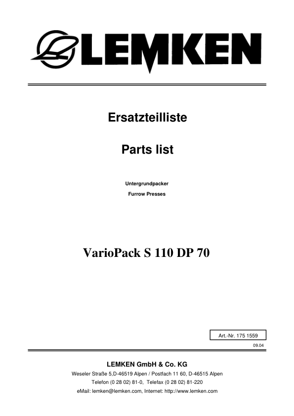 Lemken VarioPack S 110 DP 70 Furrow Press Spare Parts Catalogue