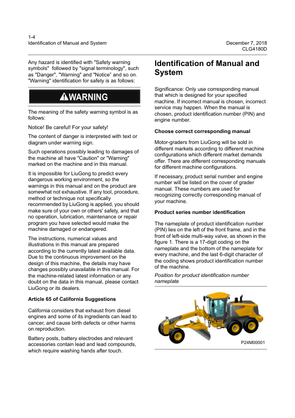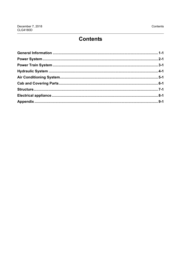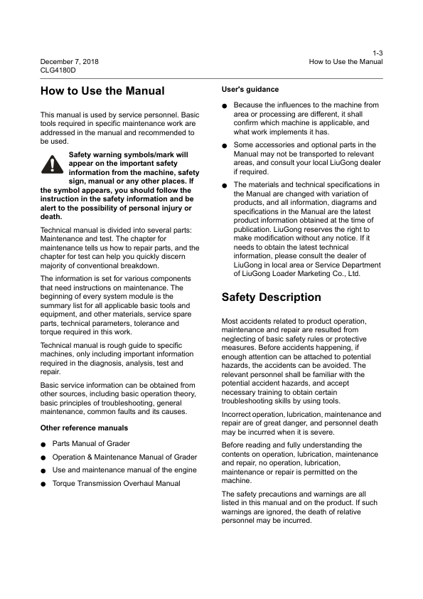 Liu Gong CLG4180 D Motor Grader Service Manual. This manual provides comprehensive technical information and detailed instructions for the proper maintenance, troubleshooting, and repair of the Liu Gong CLG4180 D motor grader. It is an essential resource for service technicians and maintenance personnel seeking to ensure optimal performance and longevity of the equipment.