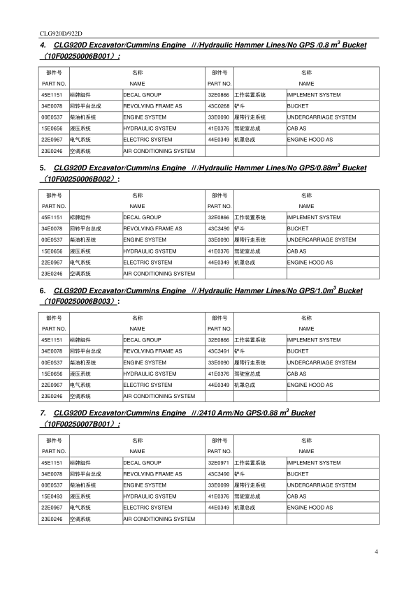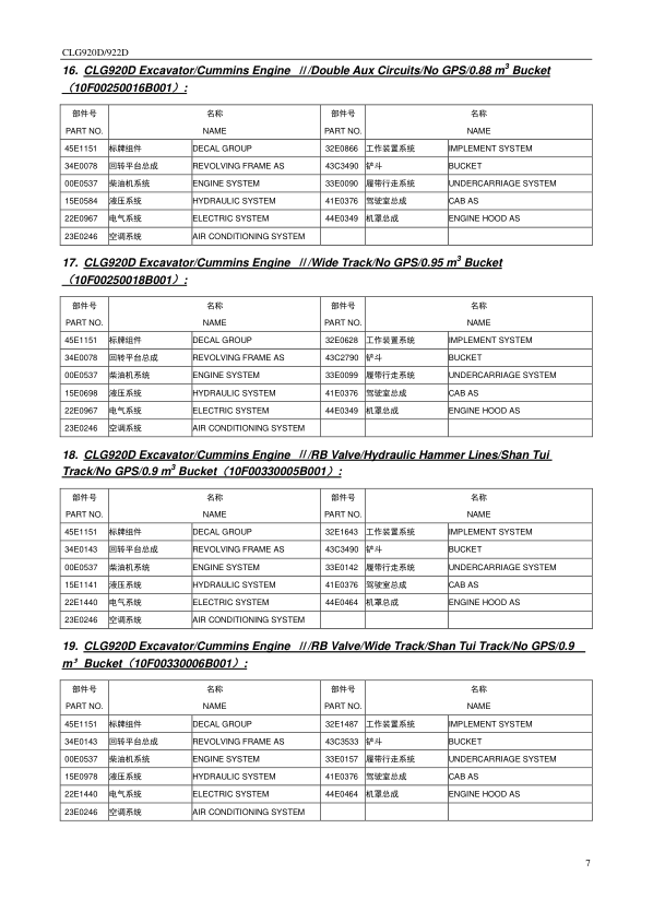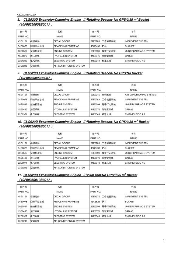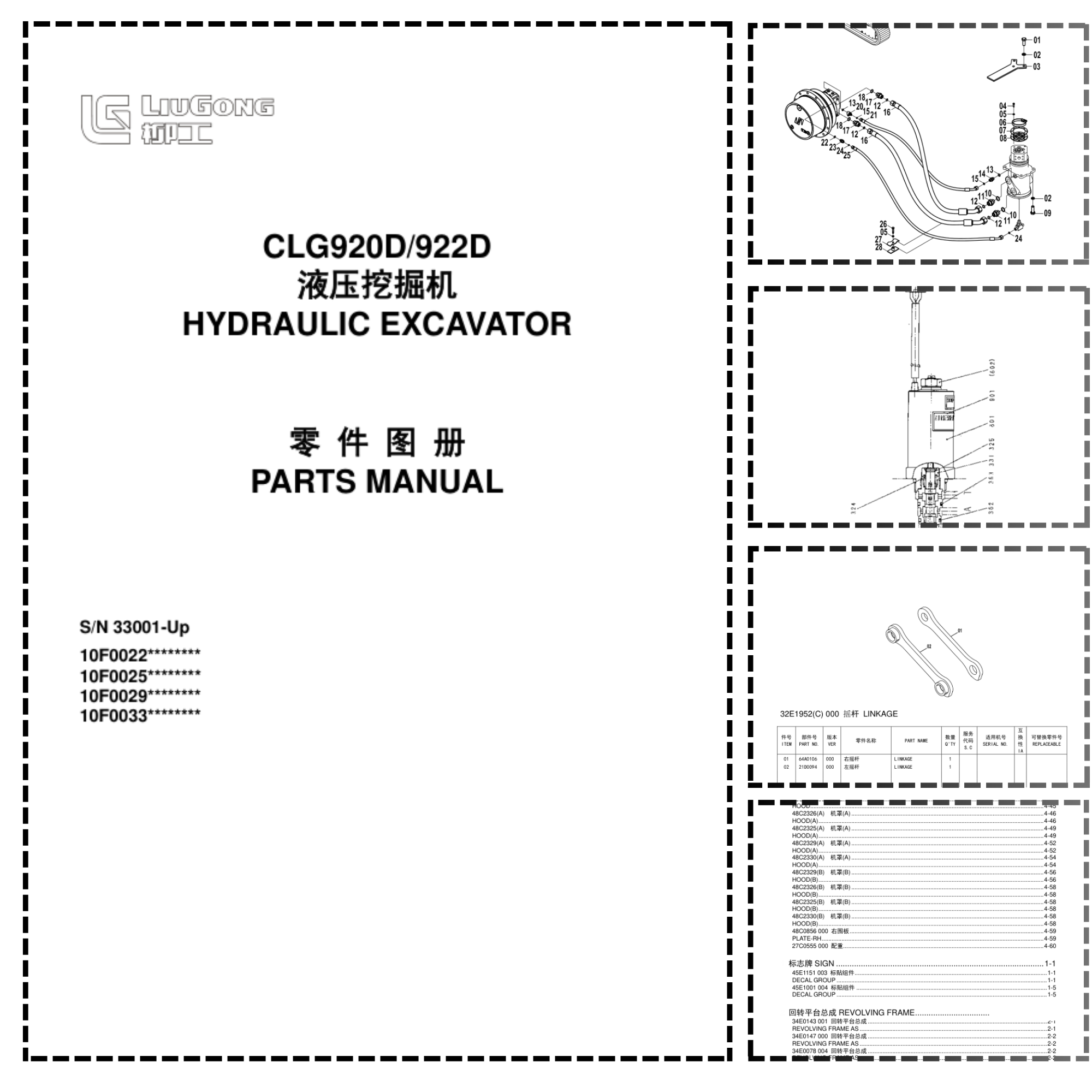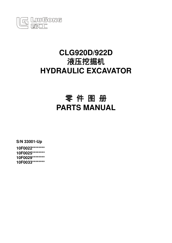 LiuGong CLG920D 922D Hydraulic Excavator Parts Catalog SN 33001 and Up